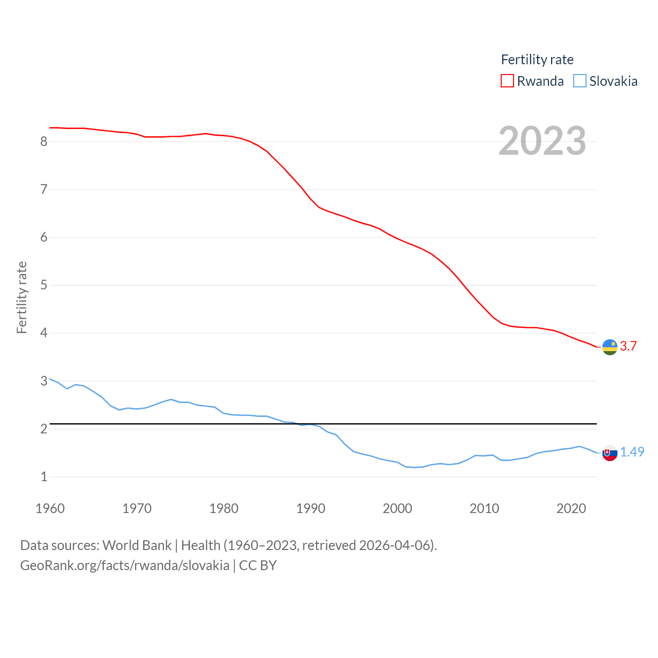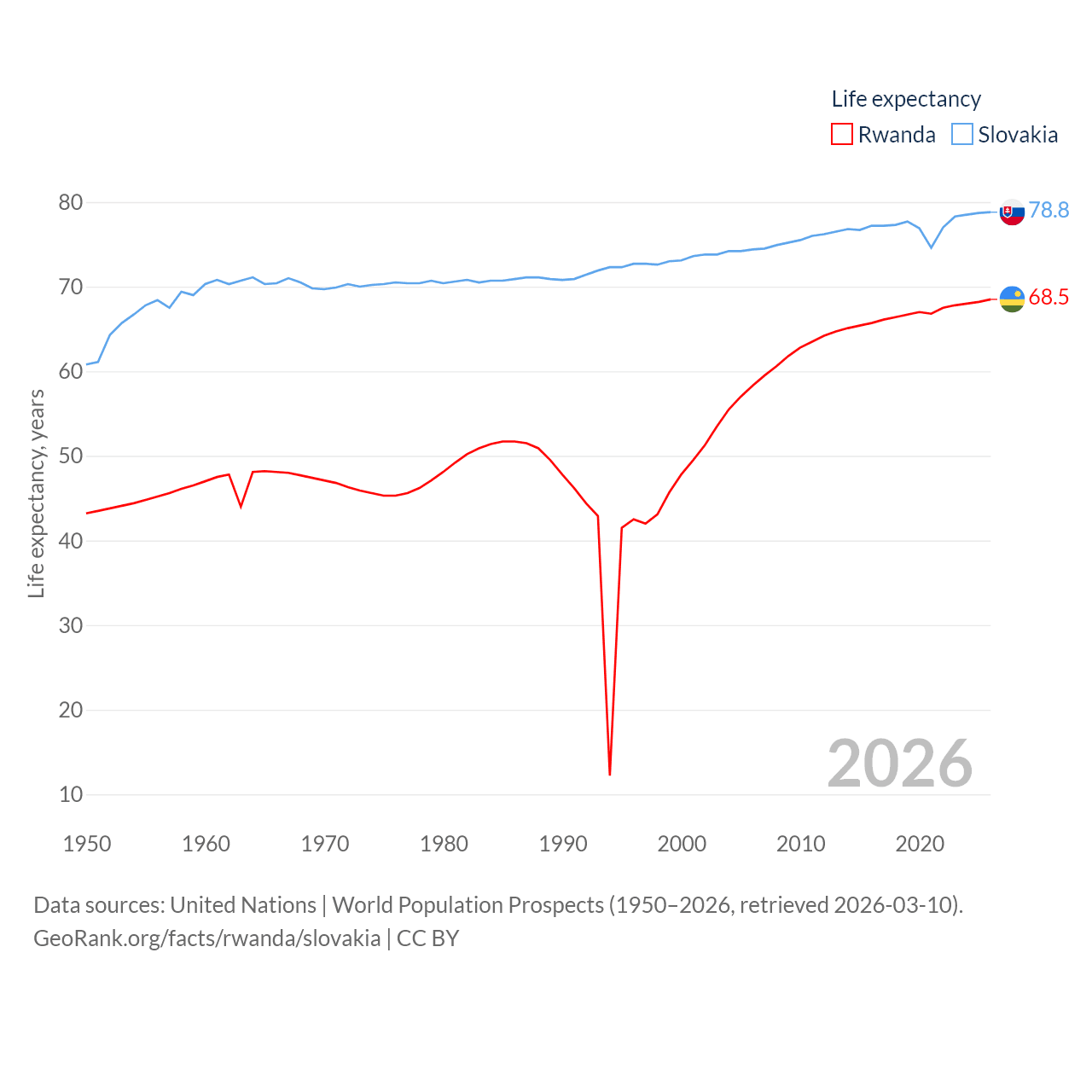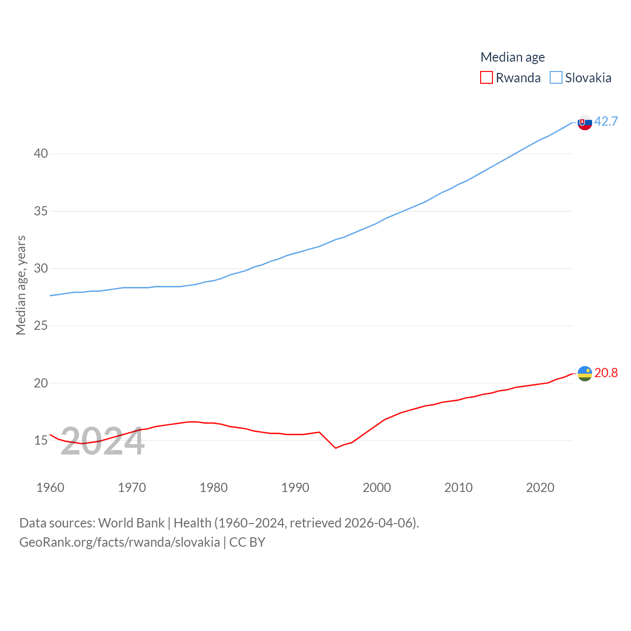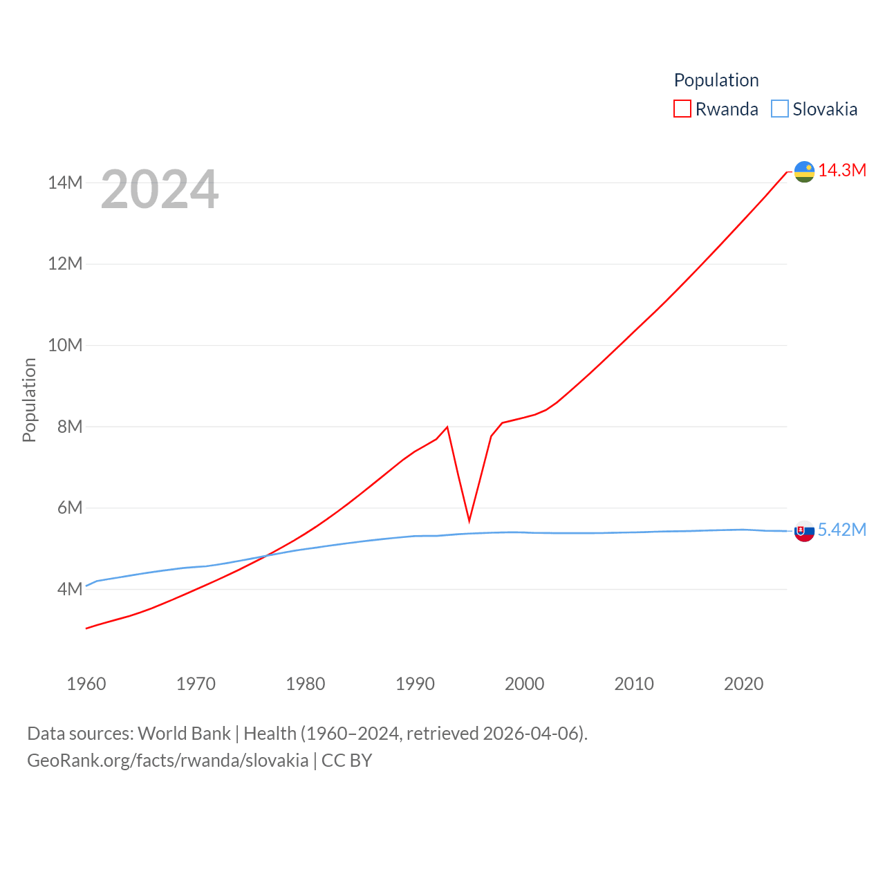 Rwanda has a population of 14.3M (ranked 77/197), compared with 5.42M in Slovakia (ranked 119/197). Rwanda's land area is 9,525 sq mi versus 18,564 sq mi for Slovakia (ranked 146th vs. 128th).