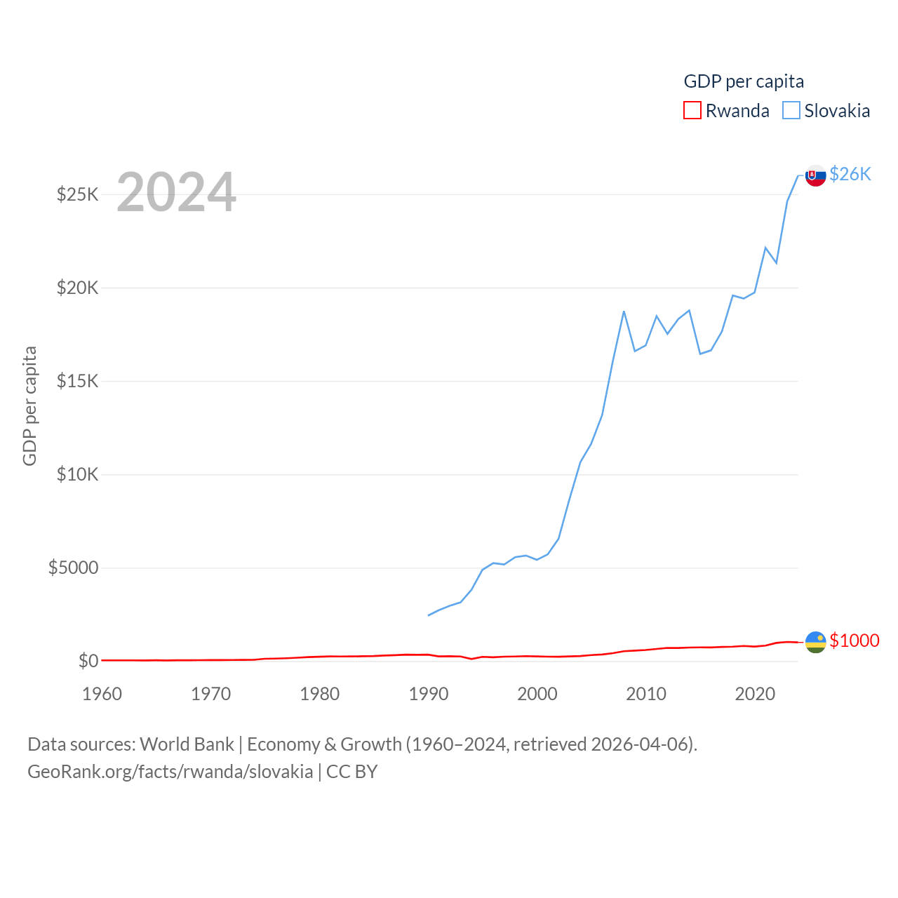 By GDP, Rwanda ranks 144/197 ($14.3B) and Slovakia ranks 61/197 ($141B). By GDP per capita, Rwanda ranks 178/197 ($1,000), while Slovakia ranks 47/197 ($25,993).