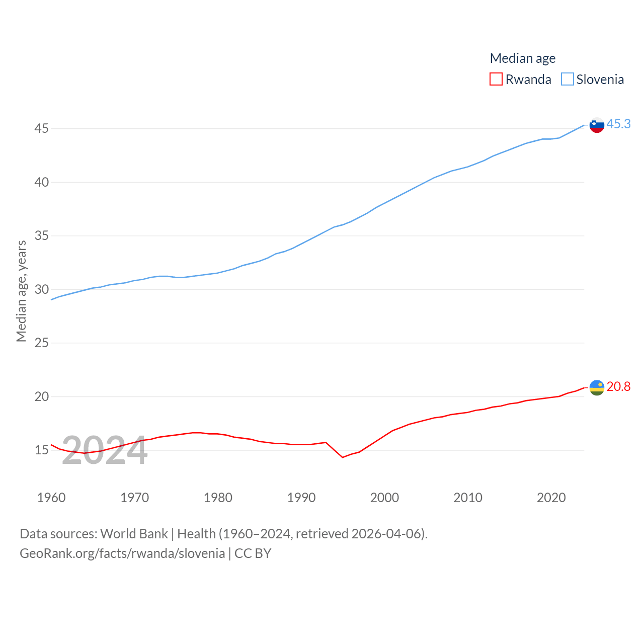 Rwanda has a population of 14.3M (ranked 77/197), compared with 2.13M in Slovenia (ranked 147/197). Rwanda's land area is 9,525 sq mi versus 7,774 sq mi for Slovenia (ranked 146th vs. 151st).