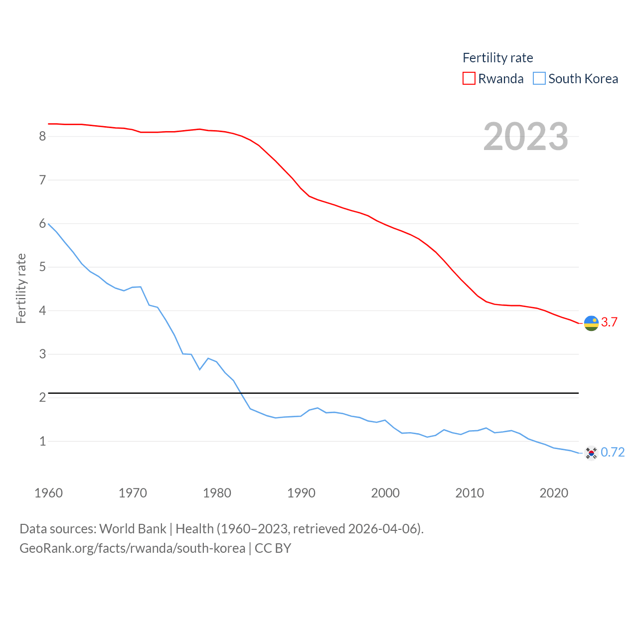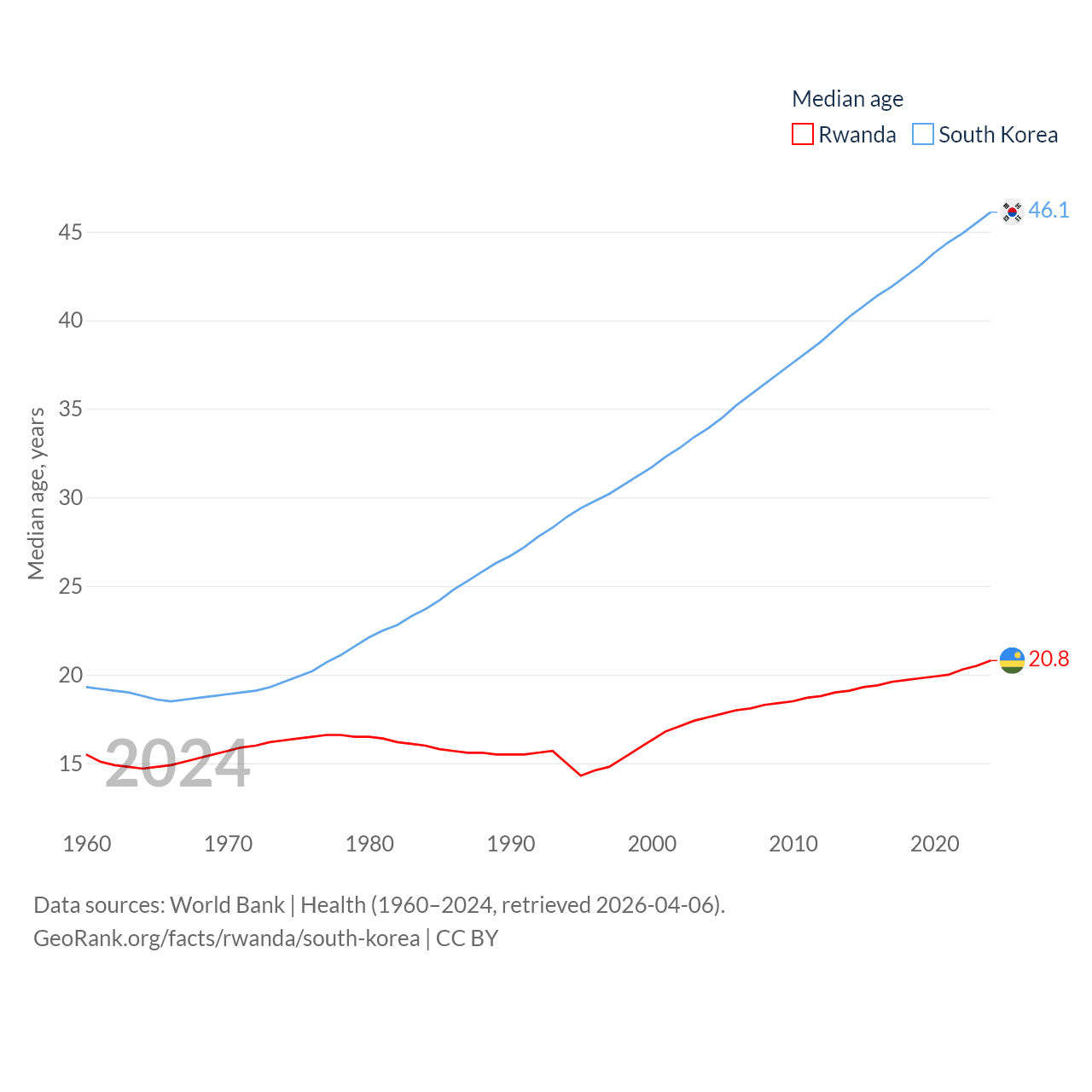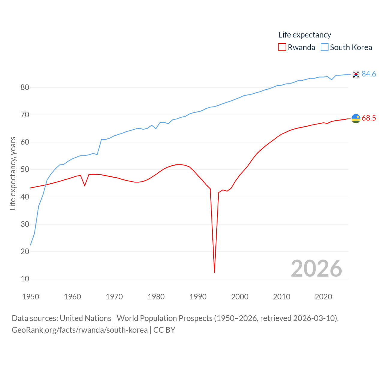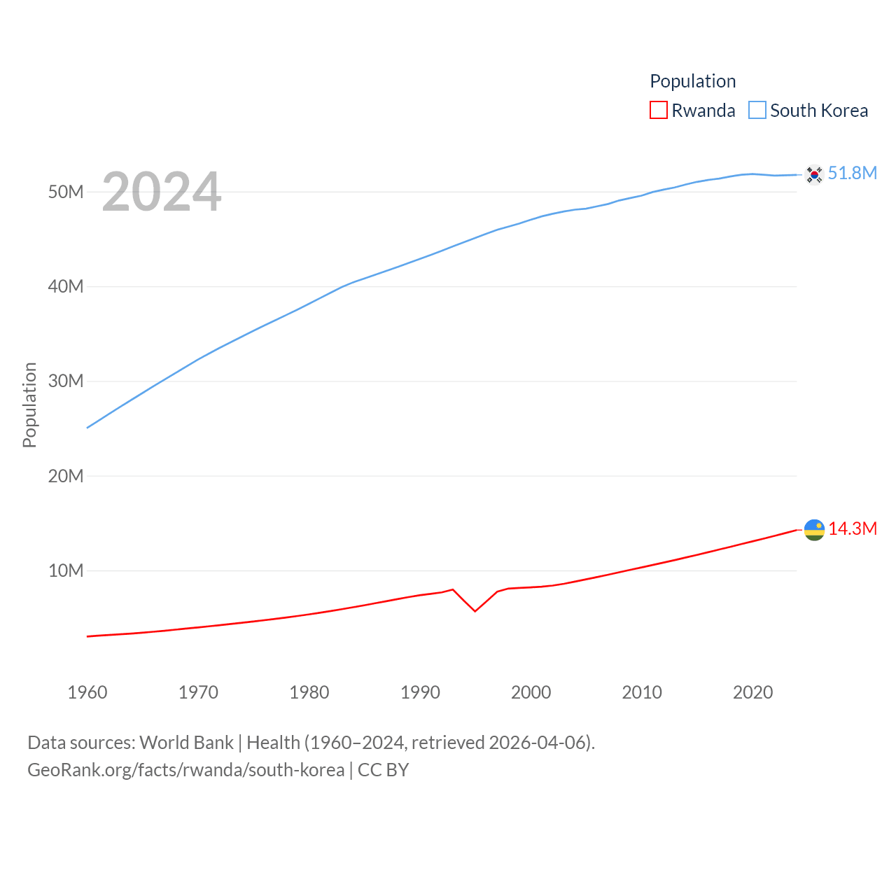 Rwanda has a population of 14.3M (ranked 77/197), compared with 51.8M in South Korea (ranked 29/197). Rwanda's land area is 9,525 sq mi versus 37,684 sq mi for South Korea (ranked 146th vs. 105th).