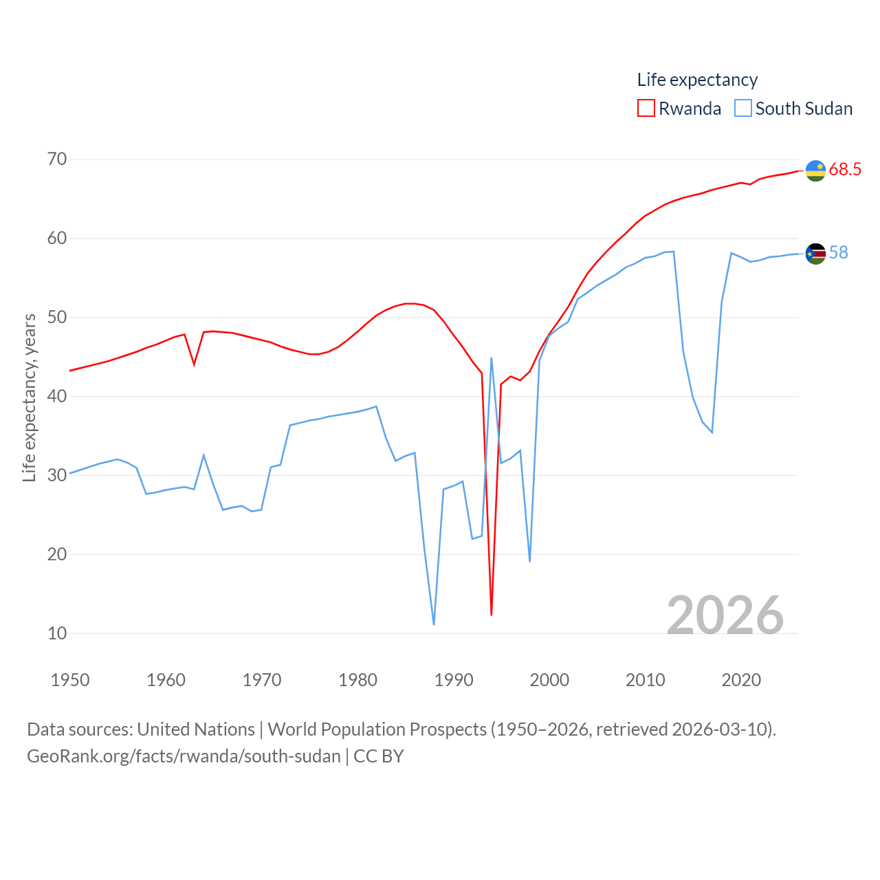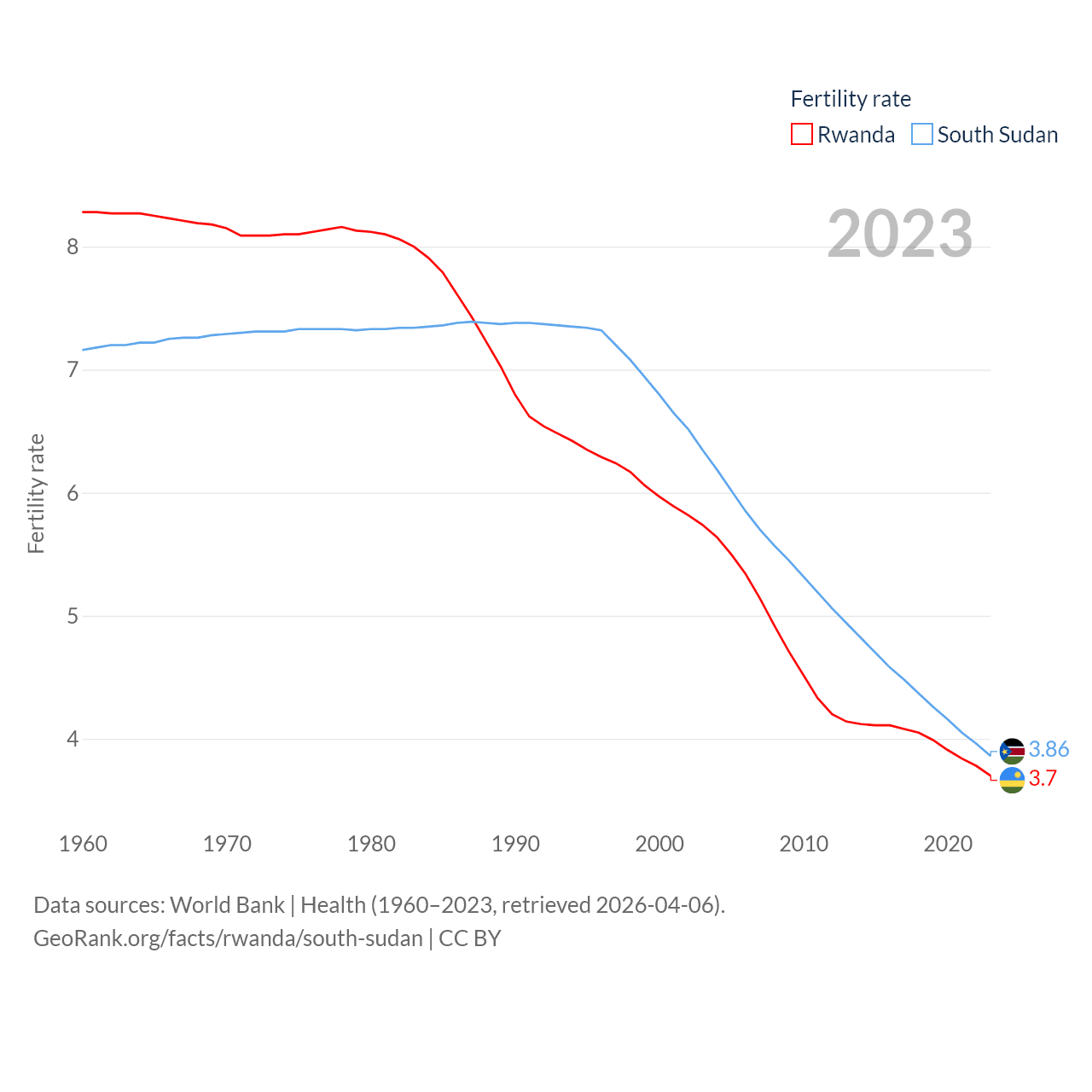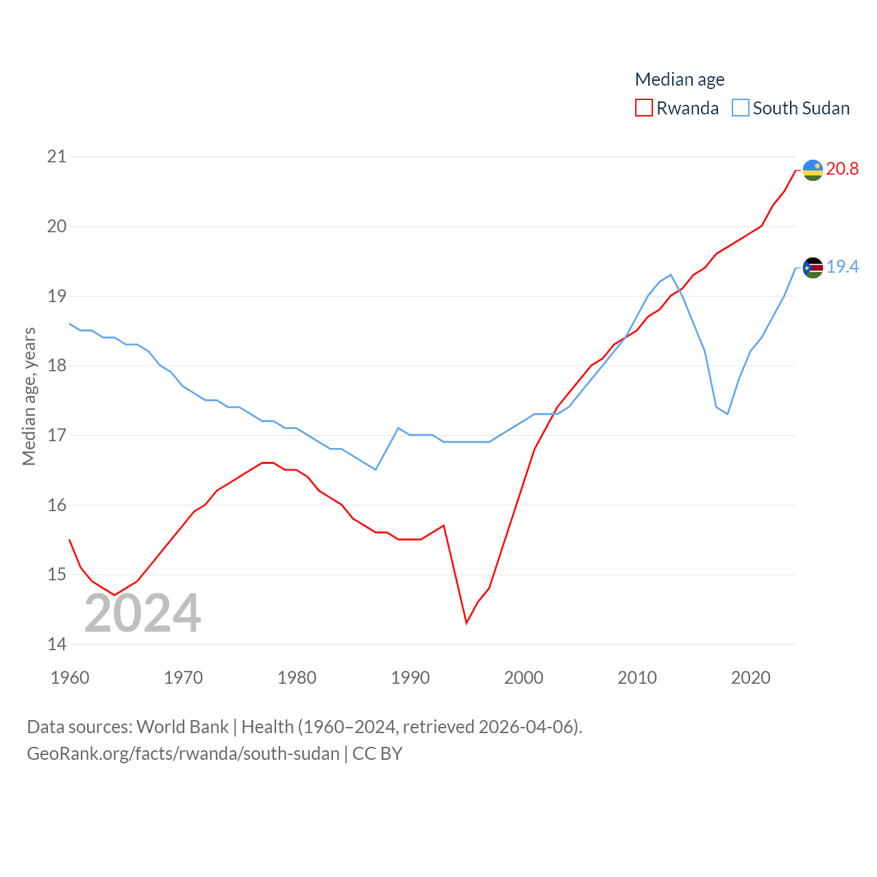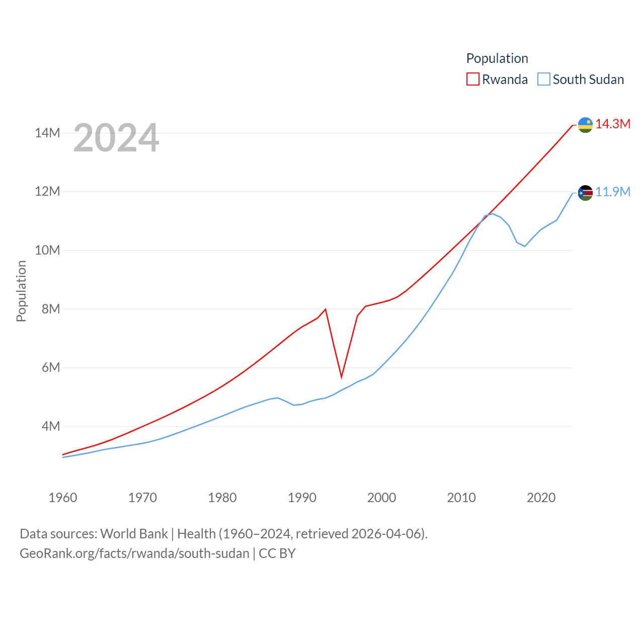 Rwanda has a population of 14.3M (ranked 77/197), compared with 11.9M in South Sudan (ranked 81/197). Rwanda's land area is 9,525 sq mi versus 243,990 sq mi for South Sudan (ranked 146th vs. 41st).