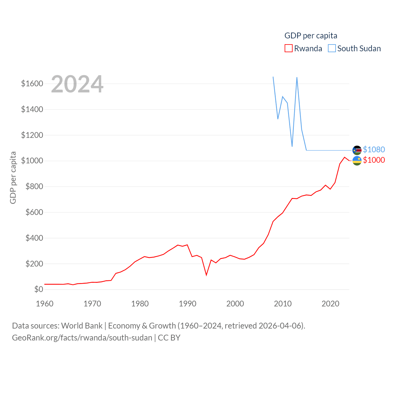 By GDP, Rwanda ranks 144/197 ($14.3B) and South Sudan ranks 149/197 ($12B). By GDP per capita, Rwanda ranks 178/197 ($1,000), while South Sudan ranks 175/197 ($1,080).