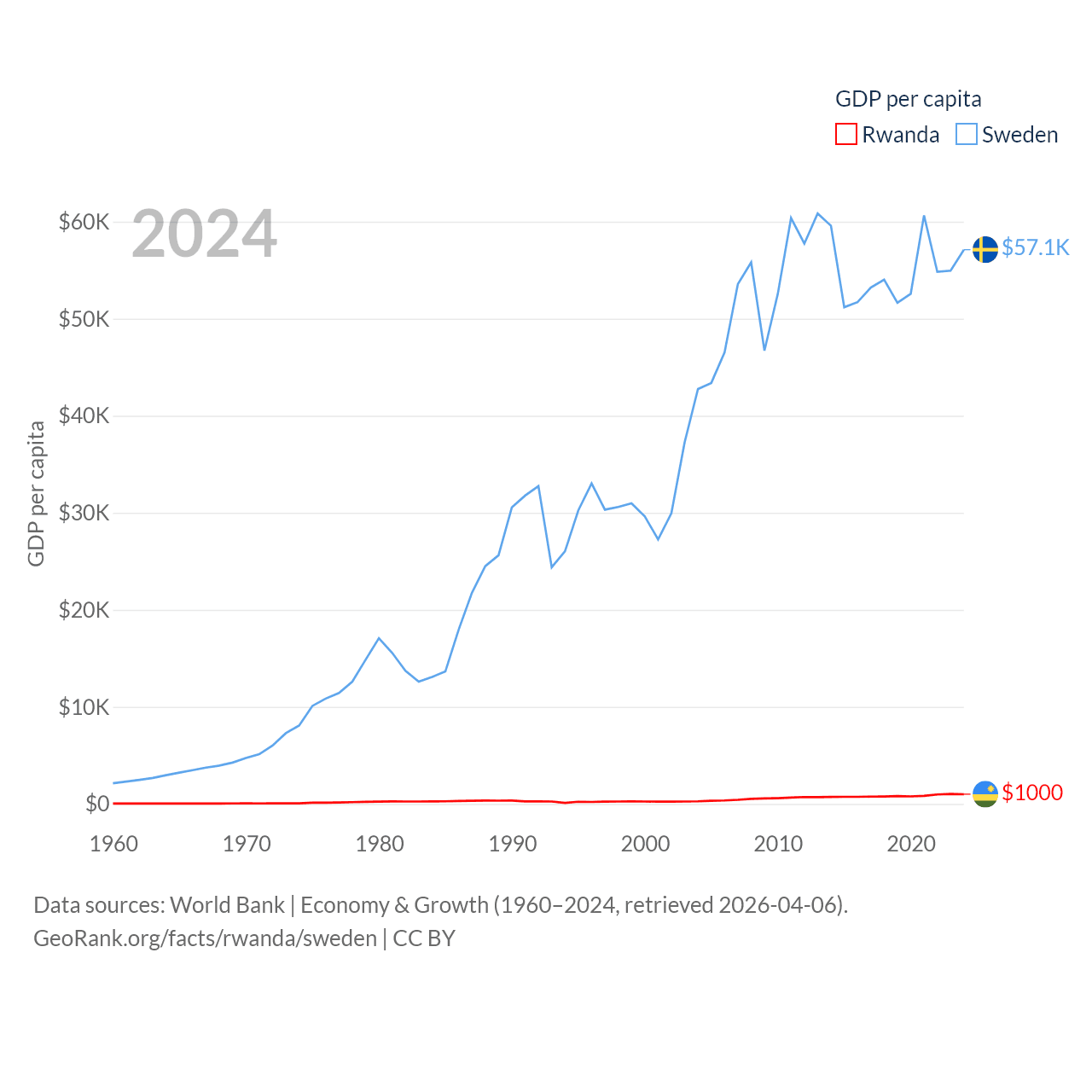 By GDP, Rwanda ranks 144/197 ($14.3B) and Sweden ranks 26/197 ($604B). By GDP per capita, Rwanda ranks 178/197 ($1,000), while Sweden ranks 17/197 ($57,117).
