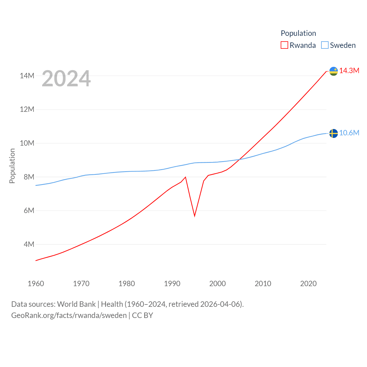 Rwanda has a population of 14.3M (ranked 77/197), compared with 10.6M in Sweden (ranked 93/197). Rwanda's land area is 9,525 sq mi versus 157,248 sq mi for Sweden (ranked 146th vs. 58th).