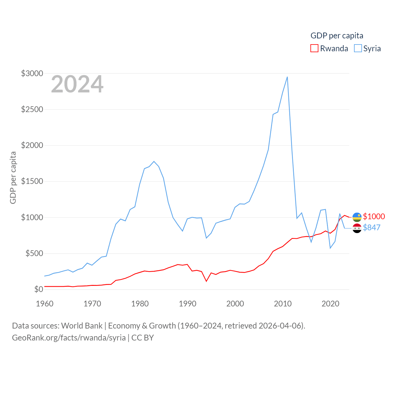 By GDP, Rwanda ranks 144/197 ($14.3B) and Syria ranks 129/197 ($20B). By GDP per capita, Rwanda ranks 178/197 ($1,000), while Syria ranks 185/197 ($847).