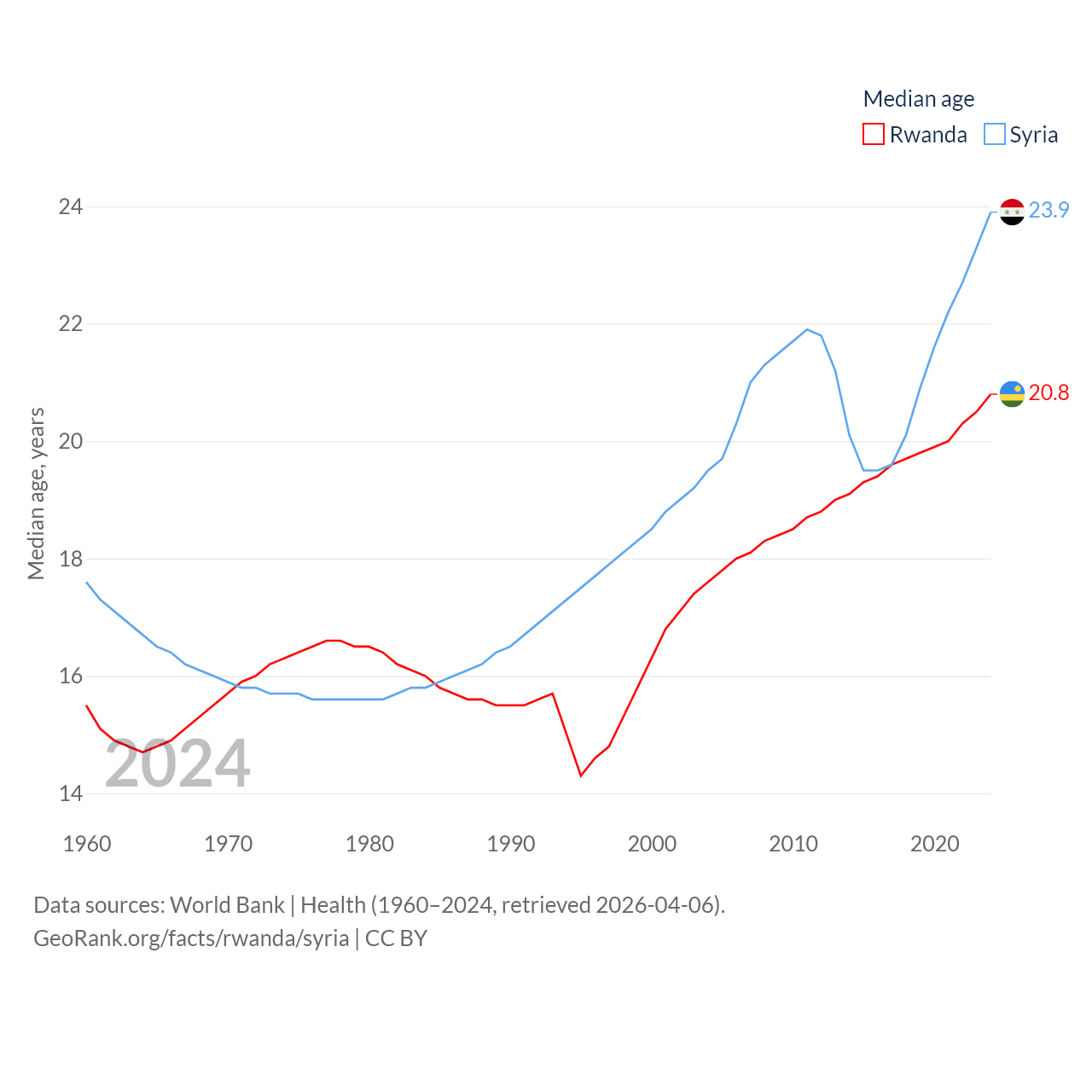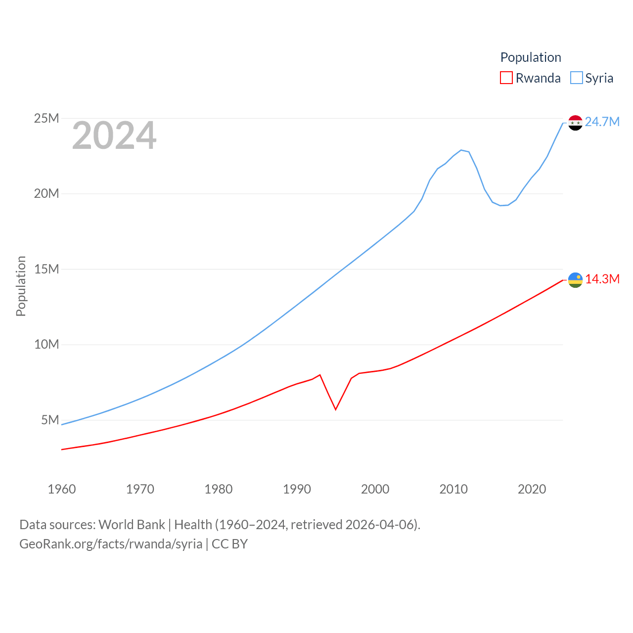 Rwanda has a population of 14.3M (ranked 77/197), compared with 24.7M in Syria (ranked 57/197). Rwanda's land area is 9,525 sq mi versus 70,900 sq mi for Syria (ranked 146th vs. 87th).