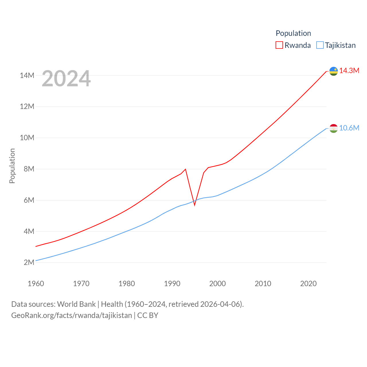 Rwanda has a population of 14.3M (ranked 77/197), compared with 10.6M in Tajikistan (ranked 91/197). Rwanda's land area is 9,525 sq mi versus 53,587 sq mi for Tajikistan (ranked 146th vs. 93rd).