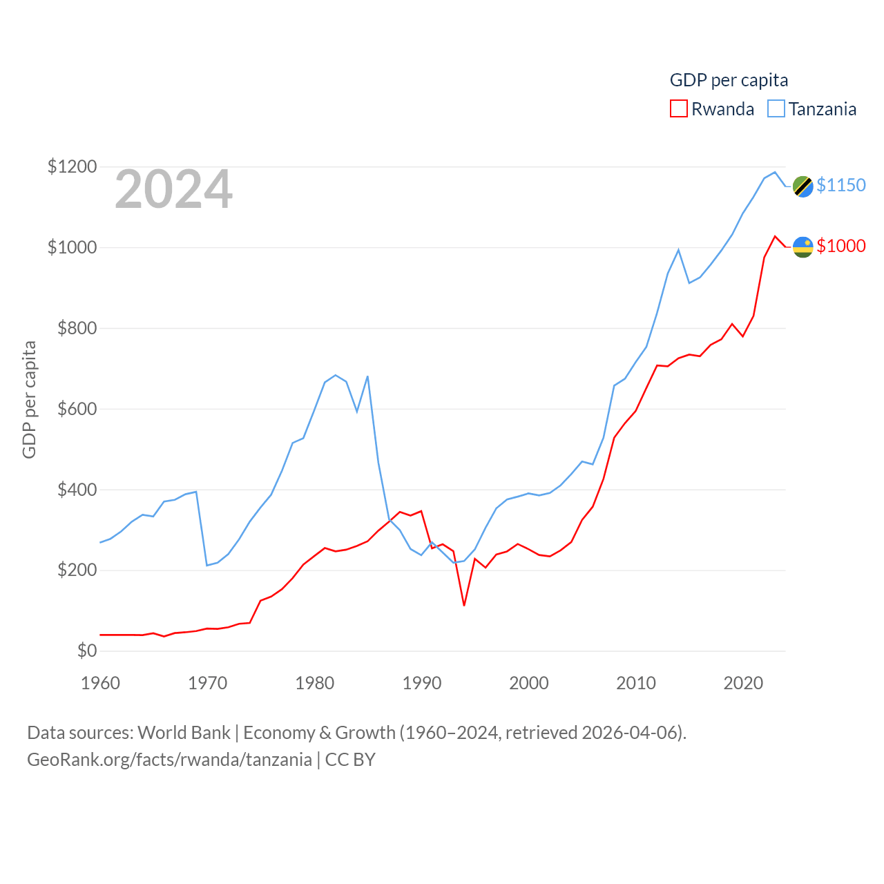 By GDP, Rwanda ranks 144/197 ($14.3B) and Tanzania ranks 82/197 ($78.8B). By GDP per capita, Rwanda ranks 178/197 ($1,000), while Tanzania ranks 170/197 ($1,150).