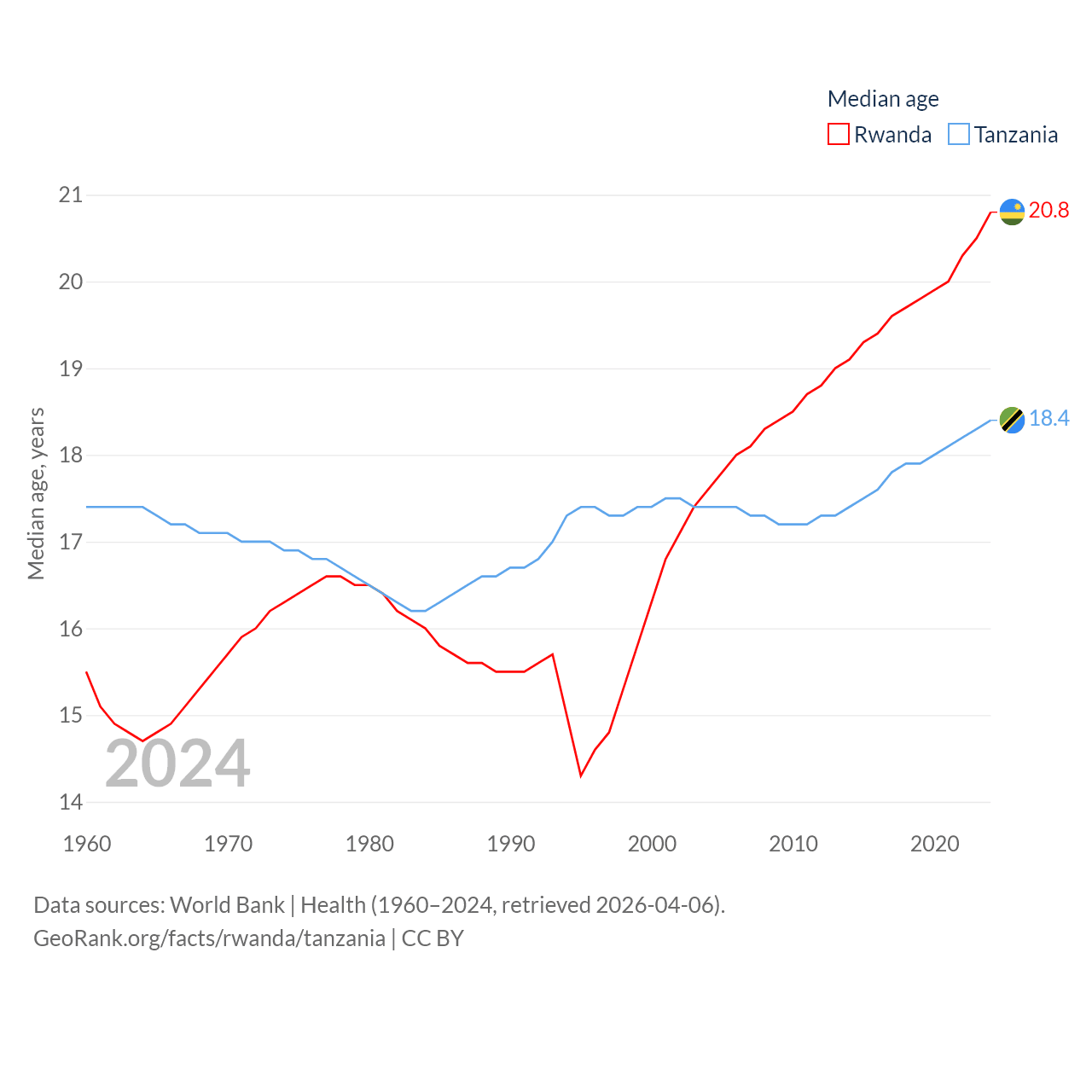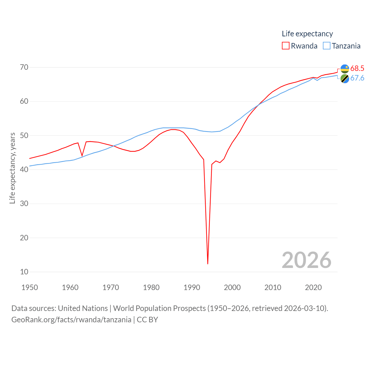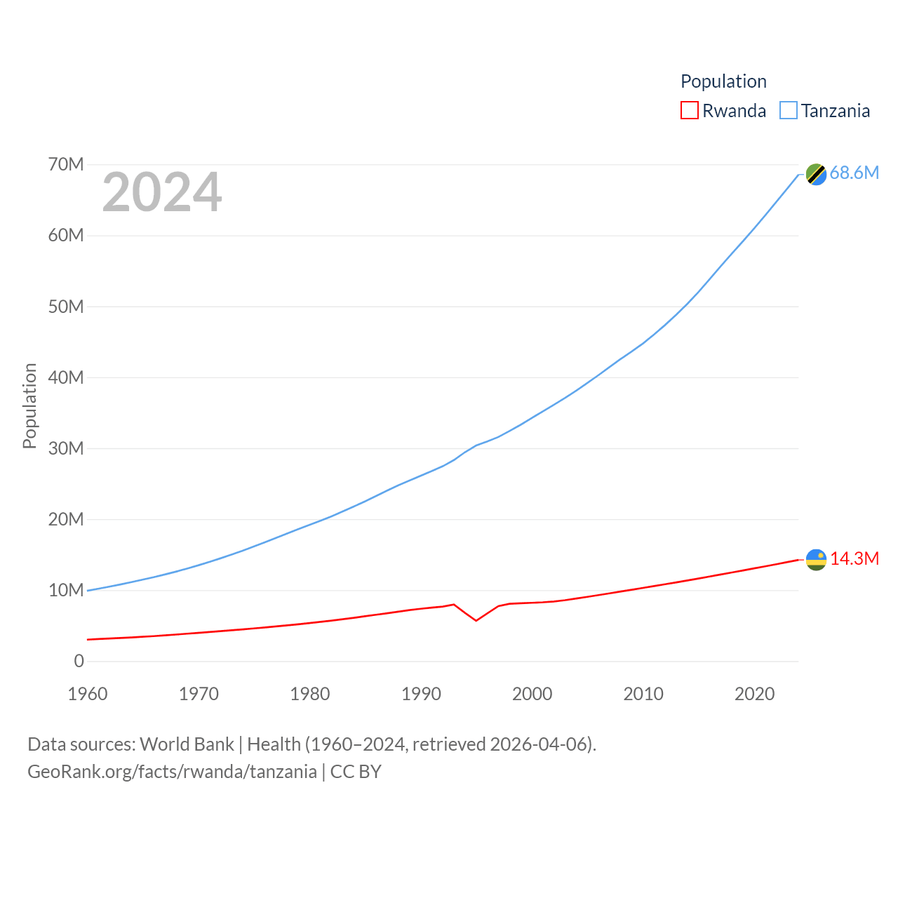 Rwanda has a population of 14.3M (ranked 77/197), compared with 68.6M in Tanzania (ranked 22/197). Rwanda's land area is 9,525 sq mi versus 342,009 sq mi for Tanzania (ranked 146th vs. 31st).