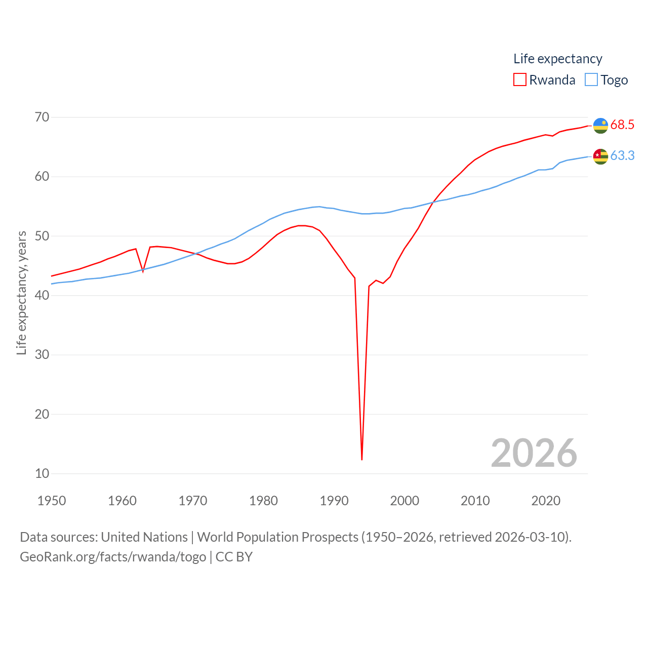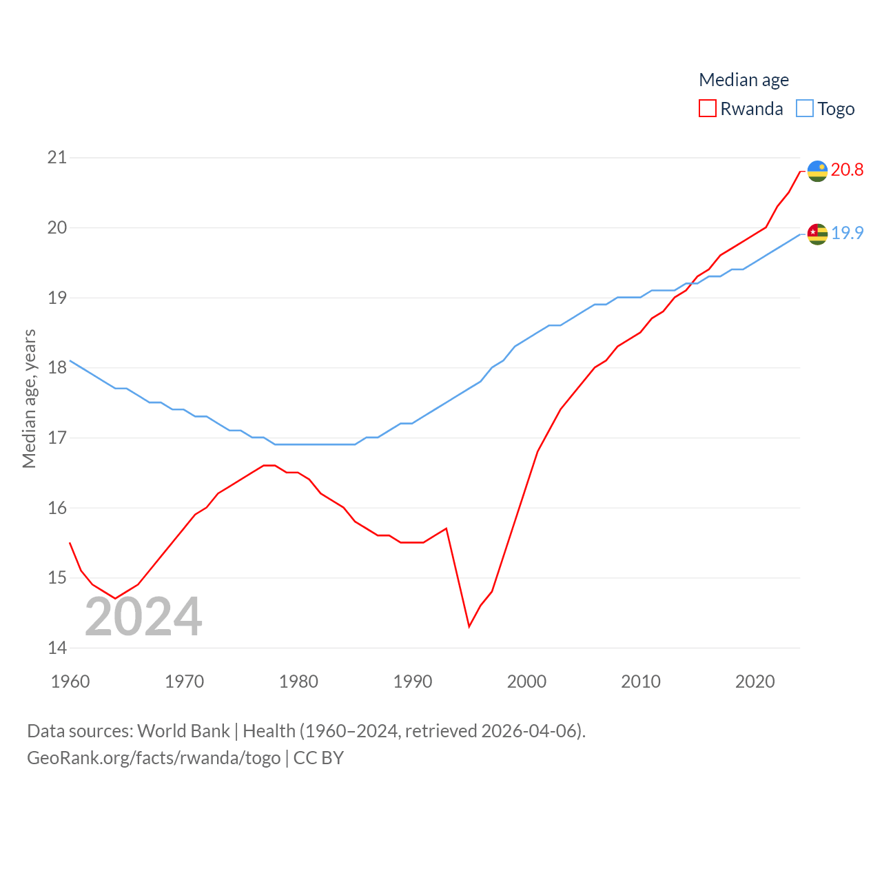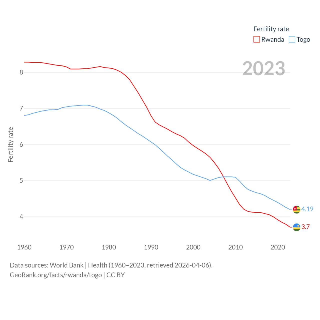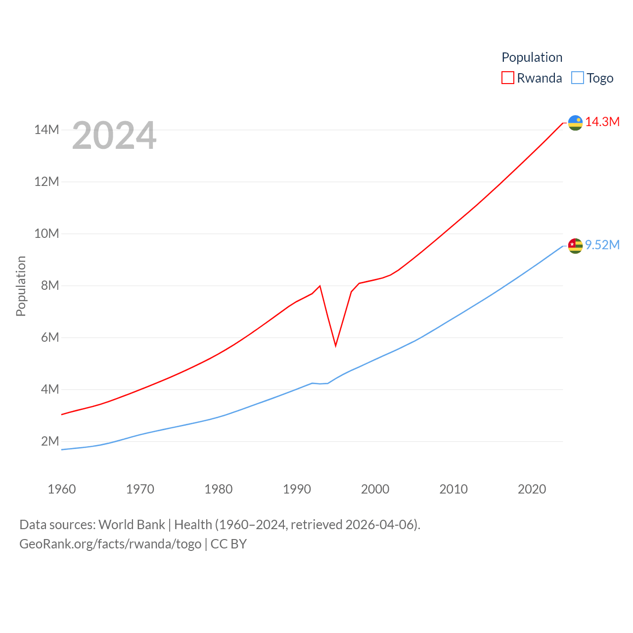 Rwanda has a population of 14.3M (ranked 77/197), compared with 9.52M in Togo (ranked 98/197). Rwanda's land area is 9,525 sq mi versus 21,000 sq mi for Togo (ranked 146th vs. 124th).