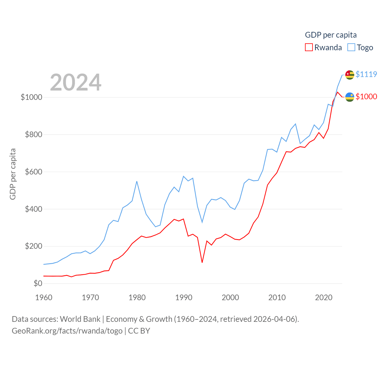 By GDP, Rwanda ranks 144/197 ($14.3B) and Togo ranks 154/197 ($10.7B). By GDP per capita, Rwanda ranks 178/197 ($1,000), while Togo ranks 172/197 ($1,119).