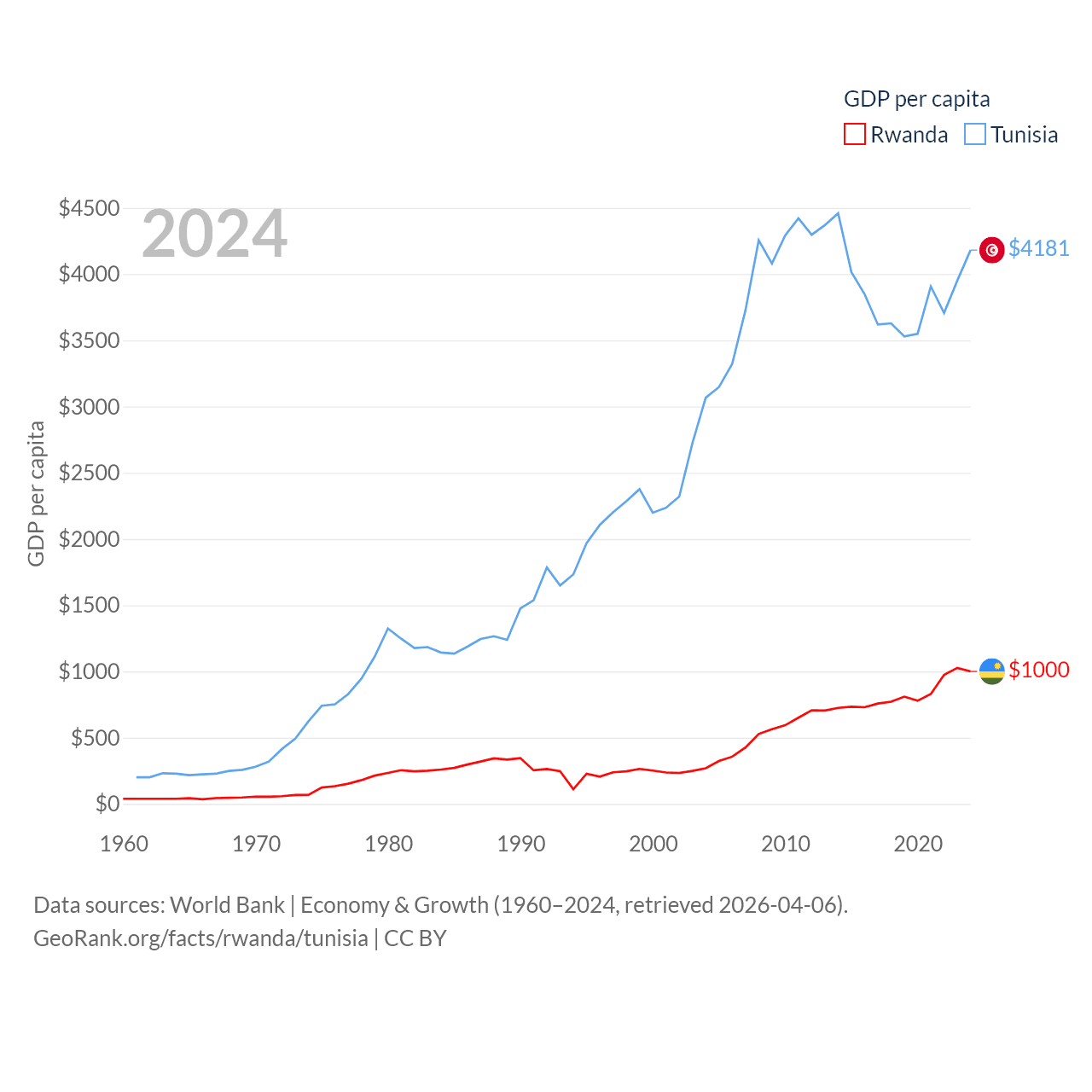 By GDP, Rwanda ranks 144/197 ($14.3B) and Tunisia ranks 93/197 ($51.3B). By GDP per capita, Rwanda ranks 178/197 ($1,000), while Tunisia ranks 129/197 ($4,181).