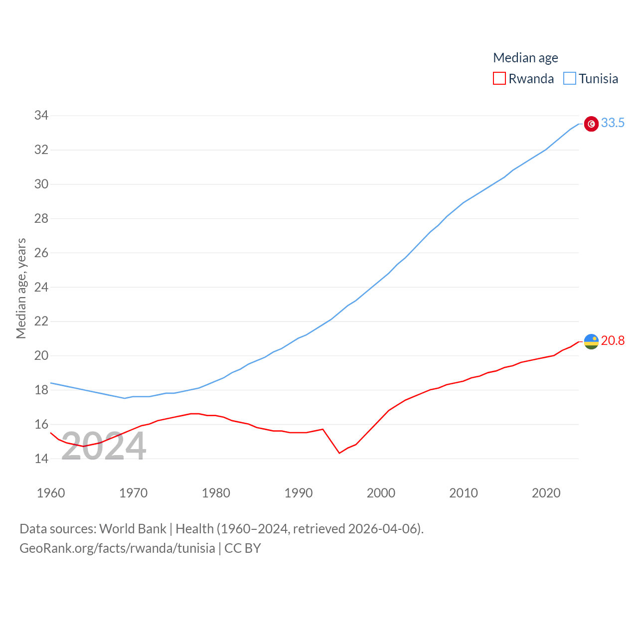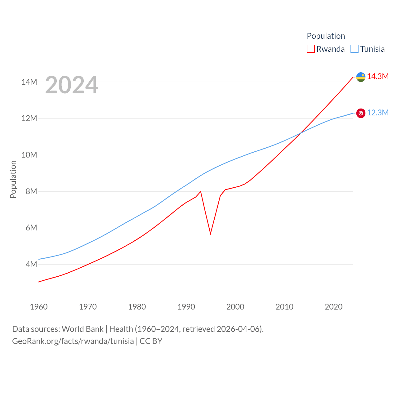 Rwanda has a population of 14.3M (ranked 77/197), compared with 12.3M in Tunisia (ranked 80/197). Rwanda's land area is 9,525 sq mi versus 59,985 sq mi for Tunisia (ranked 146th vs. 91st).