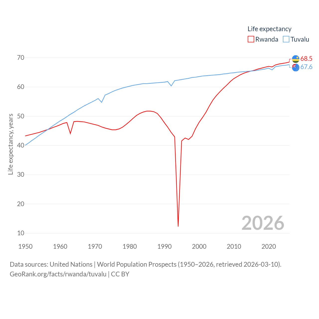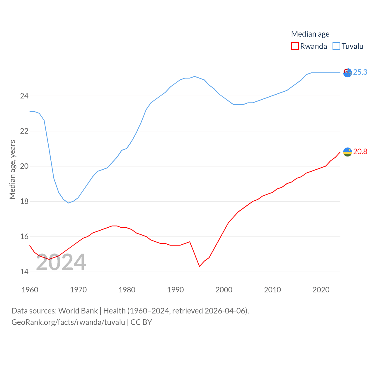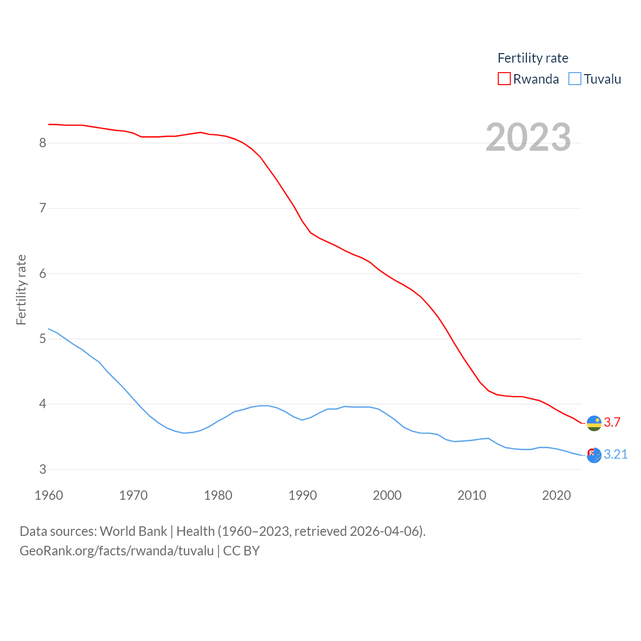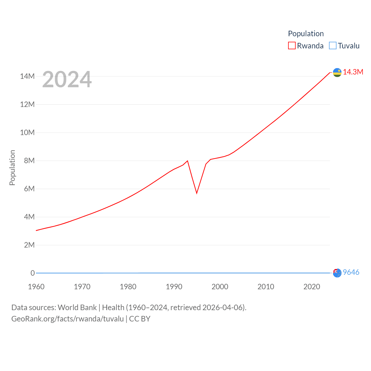 Rwanda has a population of 14.3M (ranked 77/197), compared with 9.65K in Tuvalu (ranked 196/197). Rwanda's land area is 9,525 sq mi versus 11.6 sq mi for Tuvalu (ranked 146th vs. 194th).