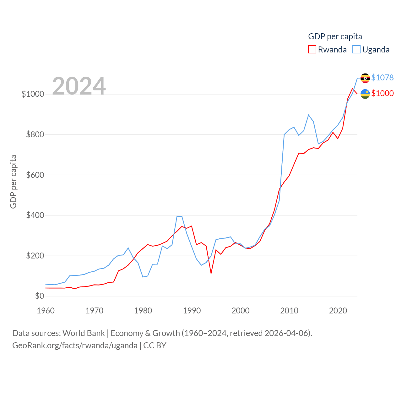 By GDP, Rwanda ranks 144/197 ($14.3B) and Uganda ranks 89/197 ($53.9B). By GDP per capita, Rwanda ranks 178/197 ($1,000), while Uganda ranks 176/197 ($1,078).