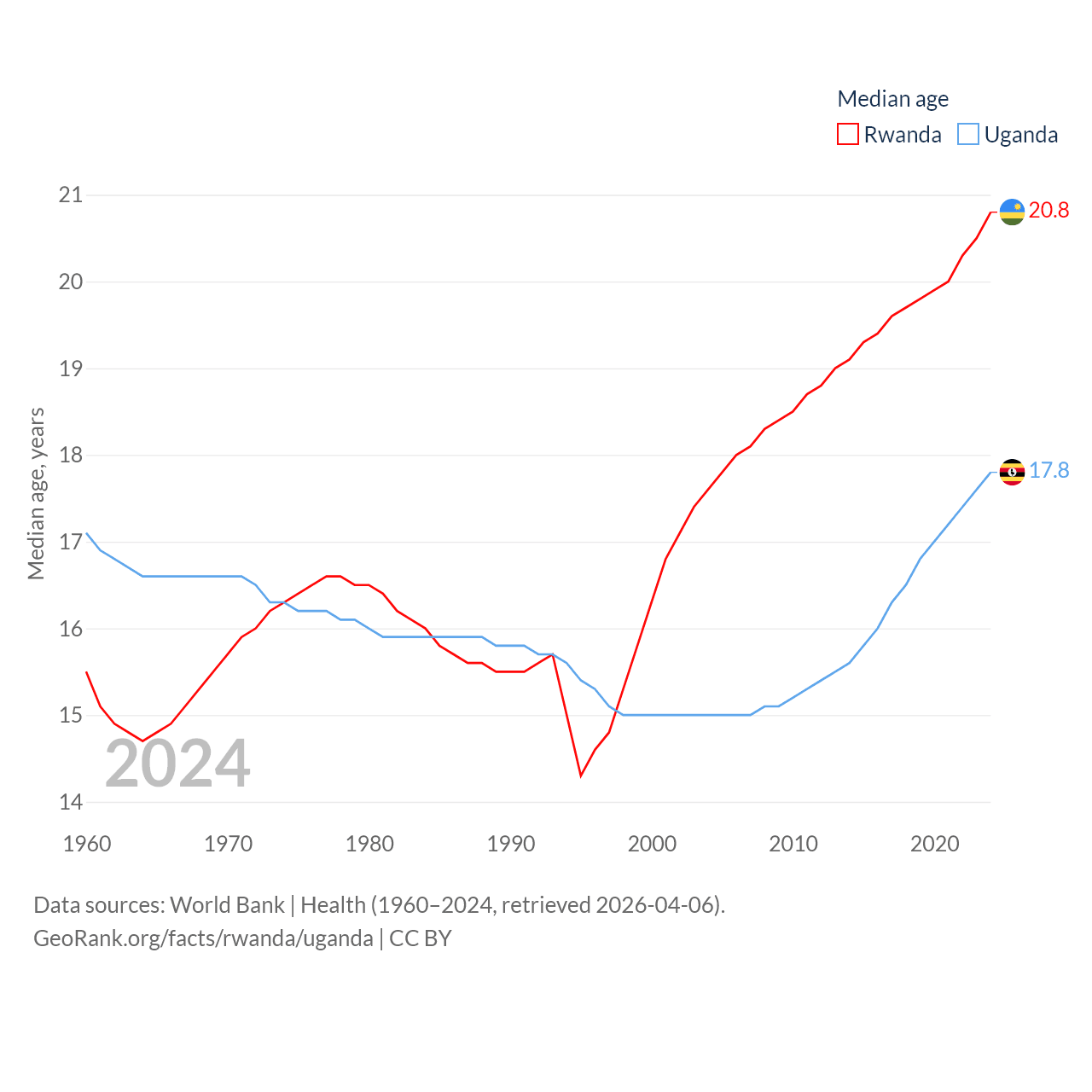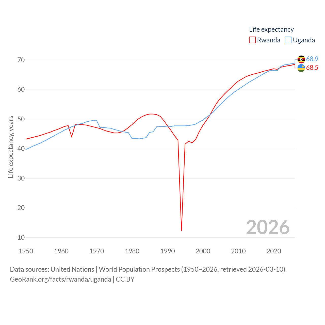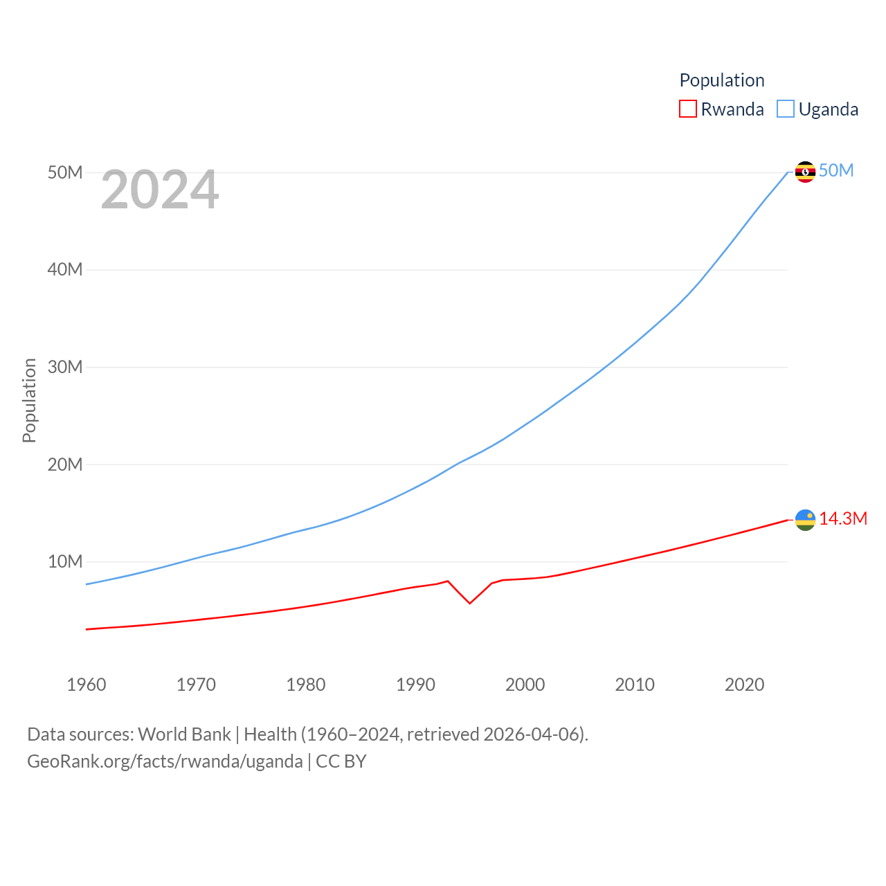 Rwanda has a population of 14.3M (ranked 77/197), compared with 50M in Uganda (ranked 31/197). Rwanda's land area is 9,525 sq mi versus 77,421 sq mi for Uganda (ranked 146th vs. 84th).