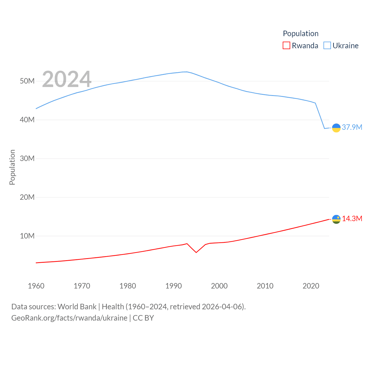 Rwanda has a population of 14.3M (ranked 77/197), compared with 37.9M in Ukraine (ranked 41/197). Rwanda's land area is 9,525 sq mi versus 223,708 sq mi for Ukraine (ranked 146th vs. 46th).