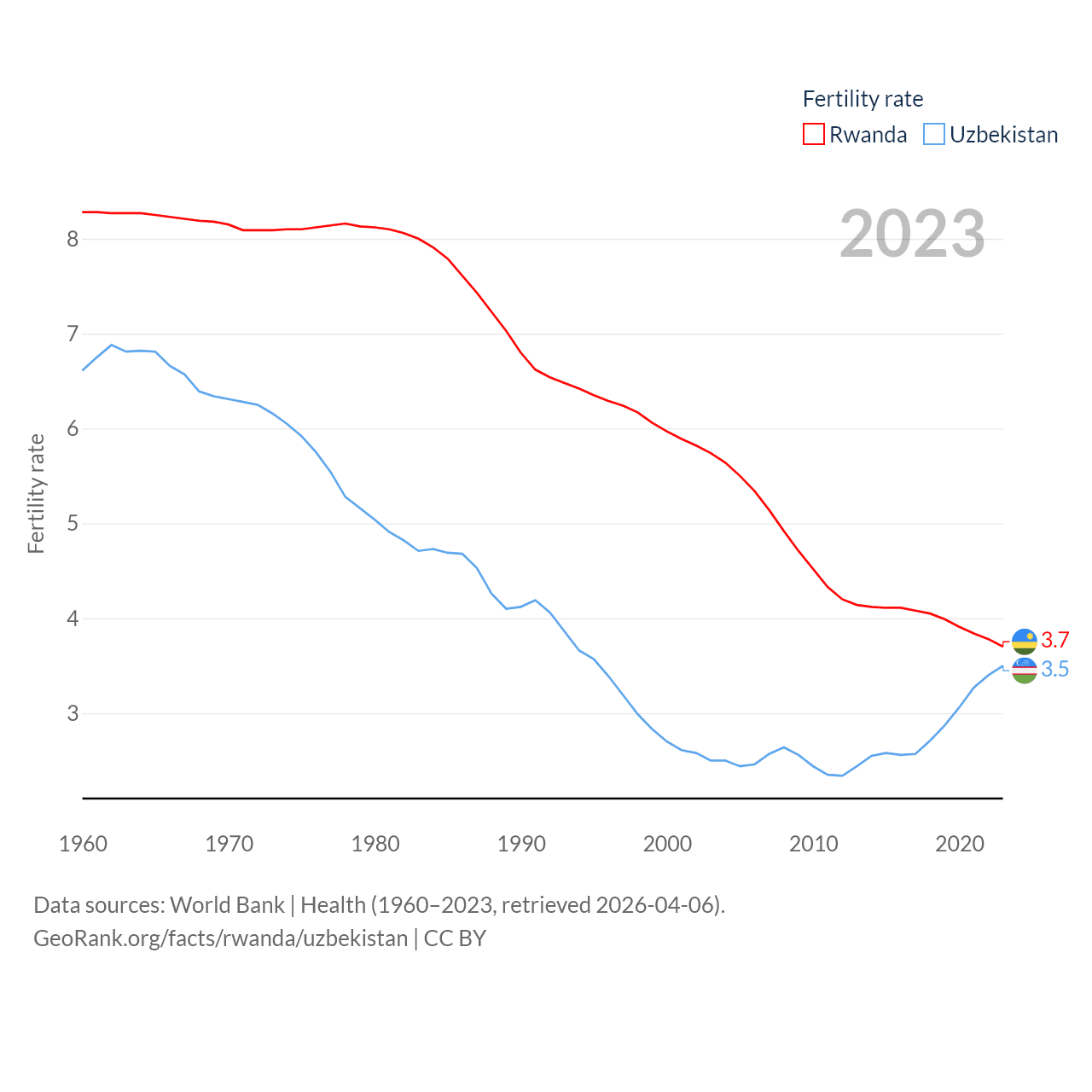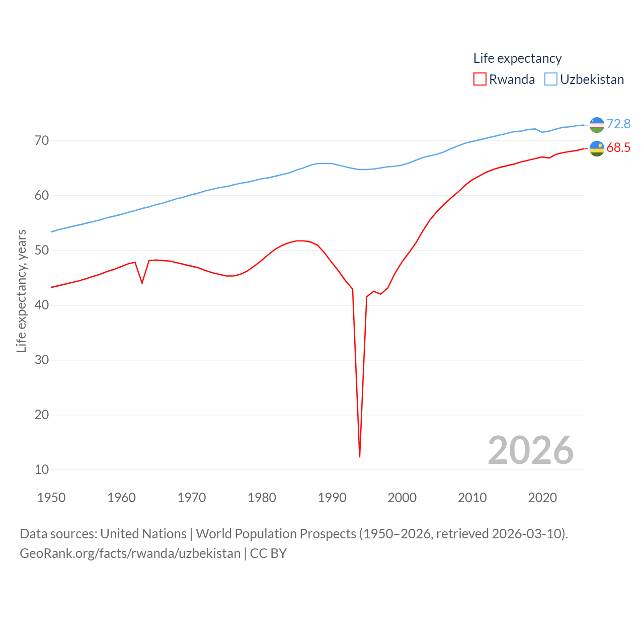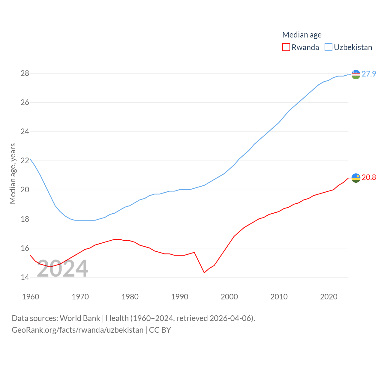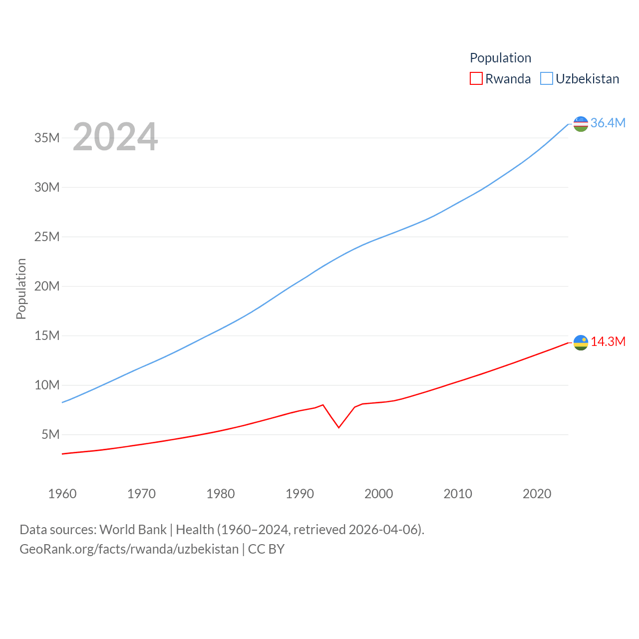 Rwanda has a population of 14.3M (ranked 77/197), compared with 36.4M in Uzbekistan (ranked 43/197). Rwanda's land area is 9,525 sq mi versus 170,136 sq mi for Uzbekistan (ranked 146th vs. 56th).