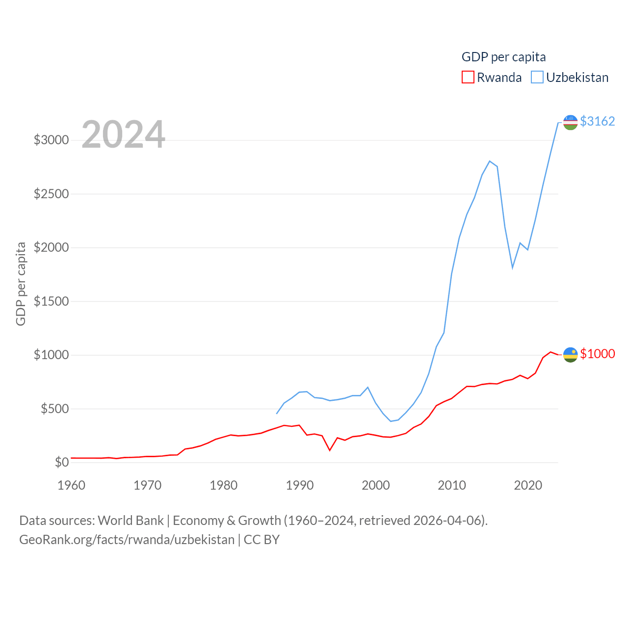 By GDP, Rwanda ranks 144/197 ($14.3B) and Uzbekistan ranks 66/197 ($115B). By GDP per capita, Rwanda ranks 178/197 ($1,000), while Uzbekistan ranks 139/197 ($3,162).