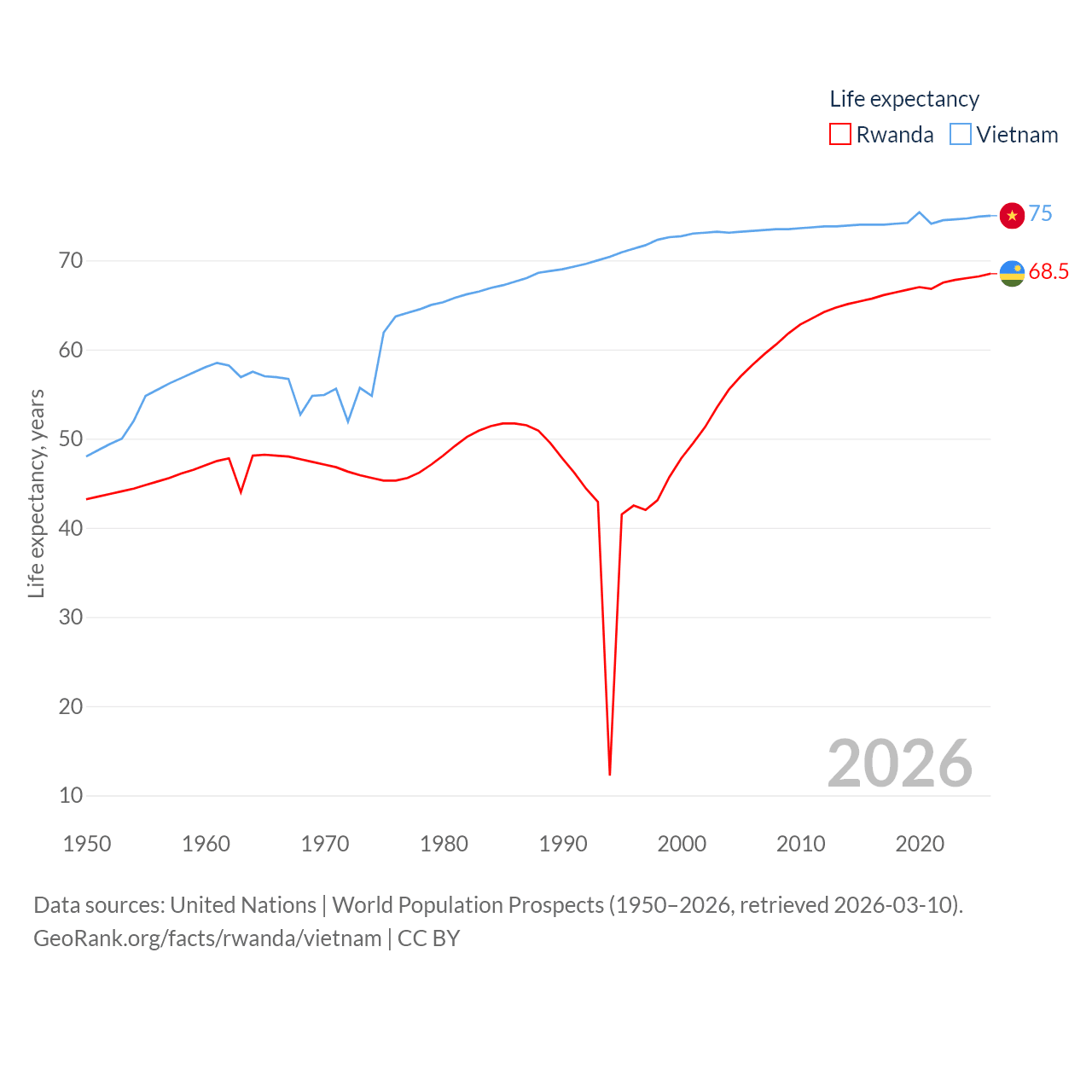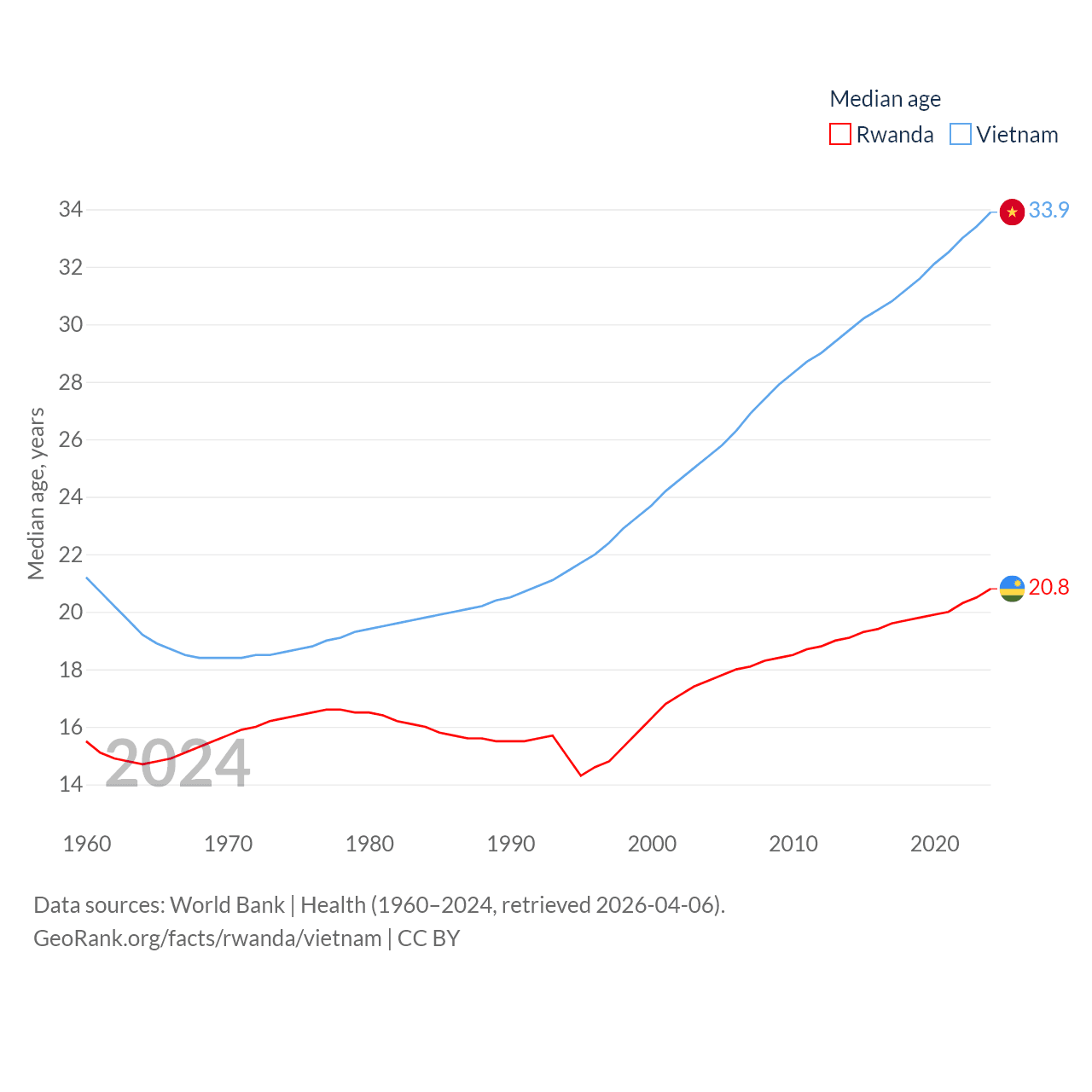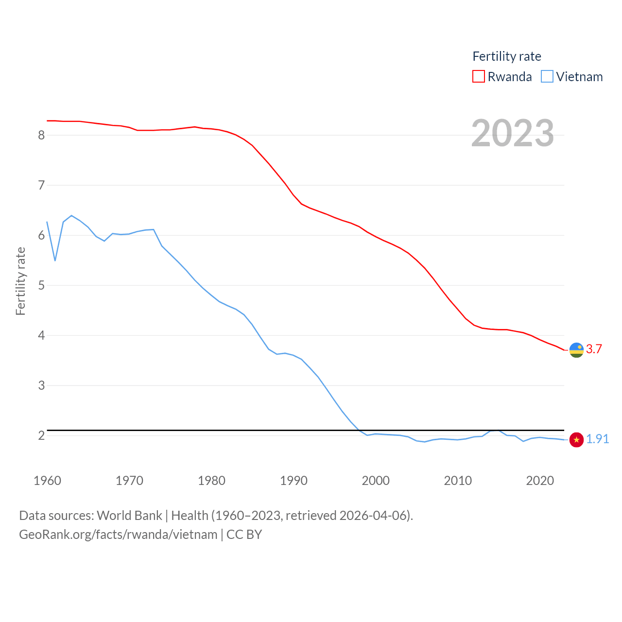 Rwanda has a population of 14.3M (ranked 77/197), compared with 101M in Vietnam (ranked 16/197). Rwanda's land area is 9,525 sq mi versus 121,016 sq mi for Vietnam (ranked 146th vs. 67th).