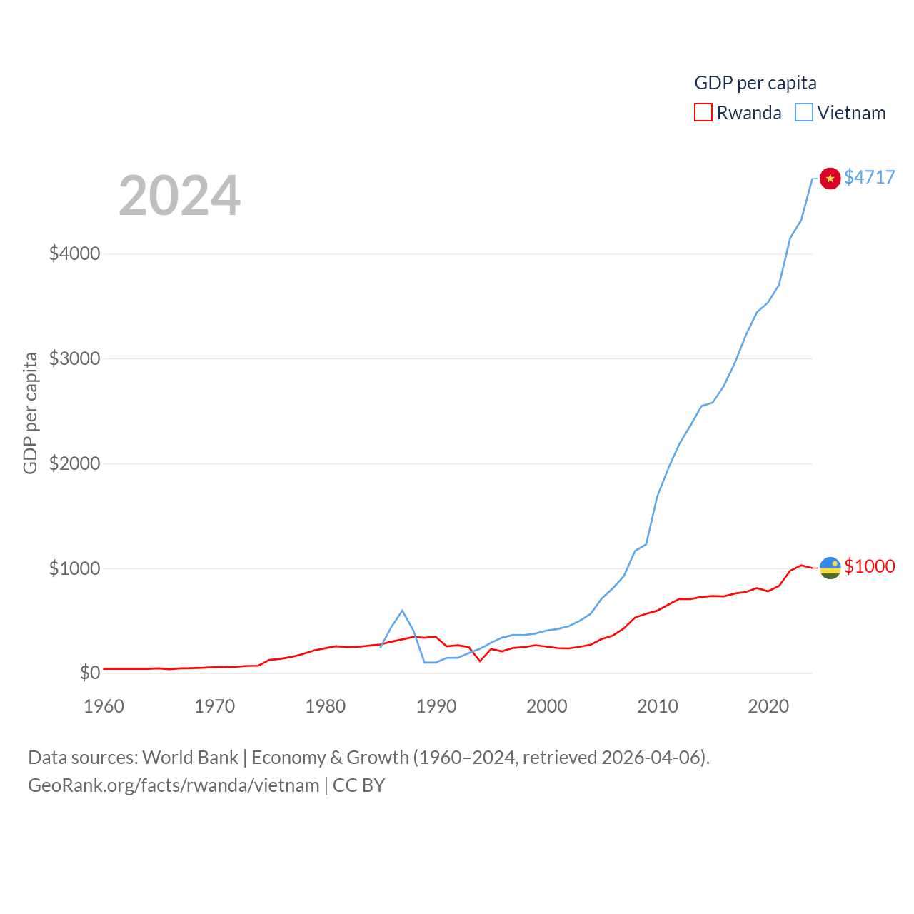 By GDP, Rwanda ranks 144/197 ($14.3B) and Vietnam ranks 33/197 ($476B). By GDP per capita, Rwanda ranks 178/197 ($1,000), while Vietnam ranks 122/197 ($4,717).