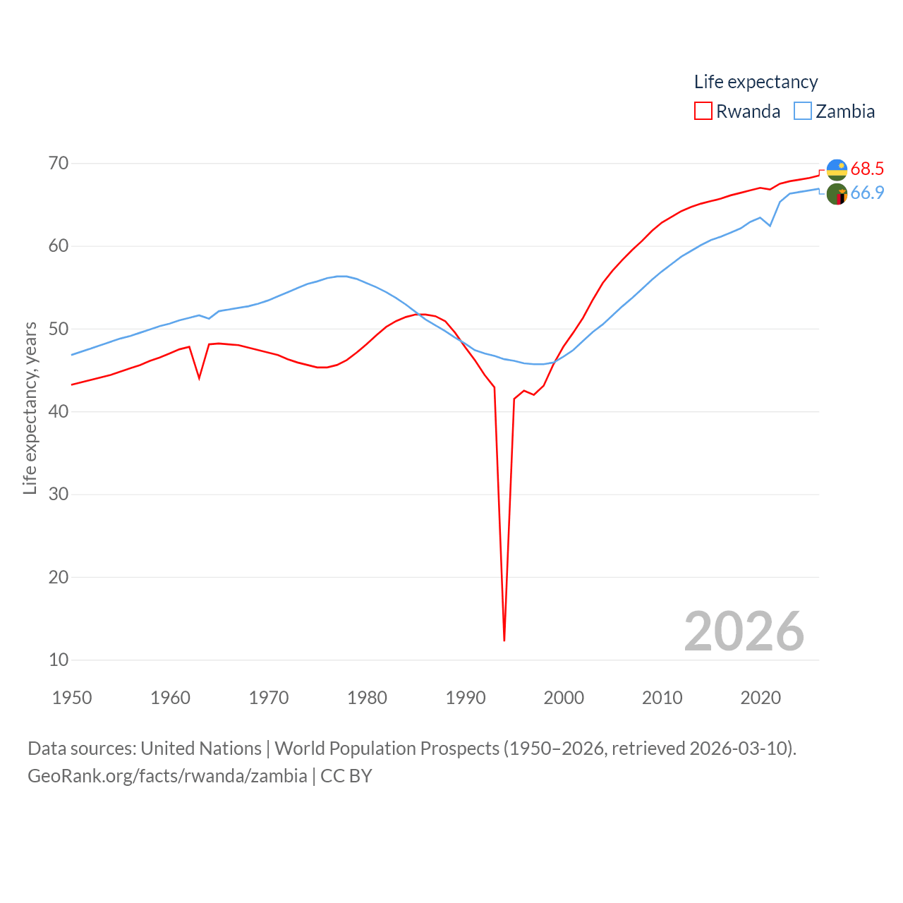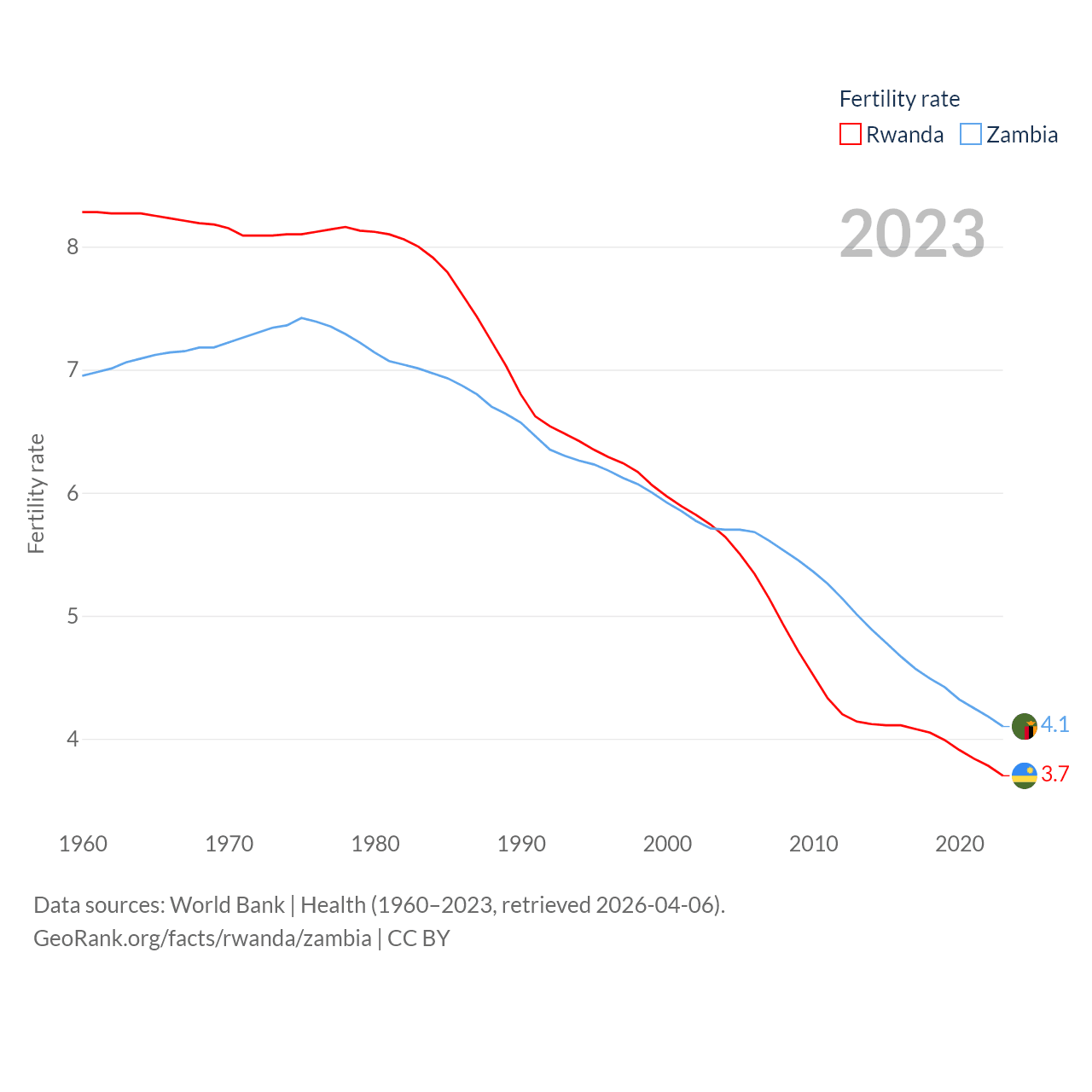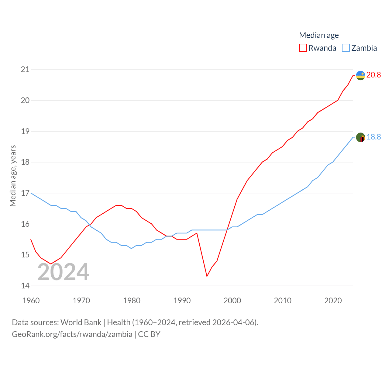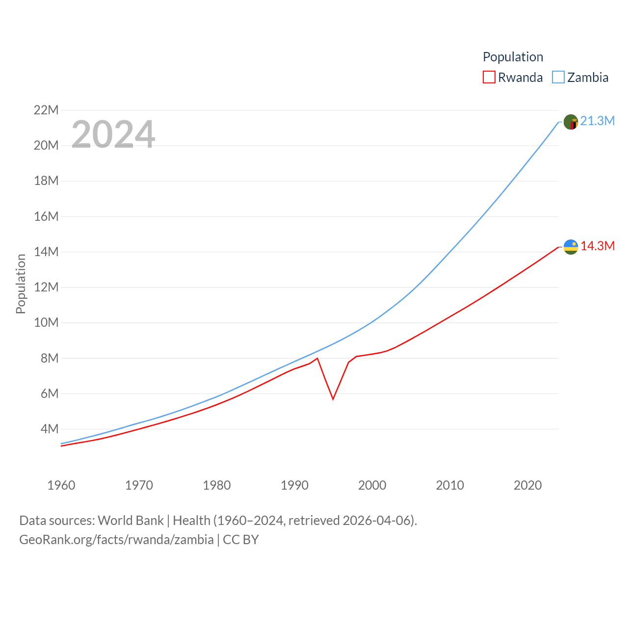 Rwanda has a population of 14.3M (ranked 77/197), compared with 21.3M in Zambia (ranked 63/197). Rwanda's land area is 9,525 sq mi versus 287,024 sq mi for Zambia (ranked 146th vs. 37th).