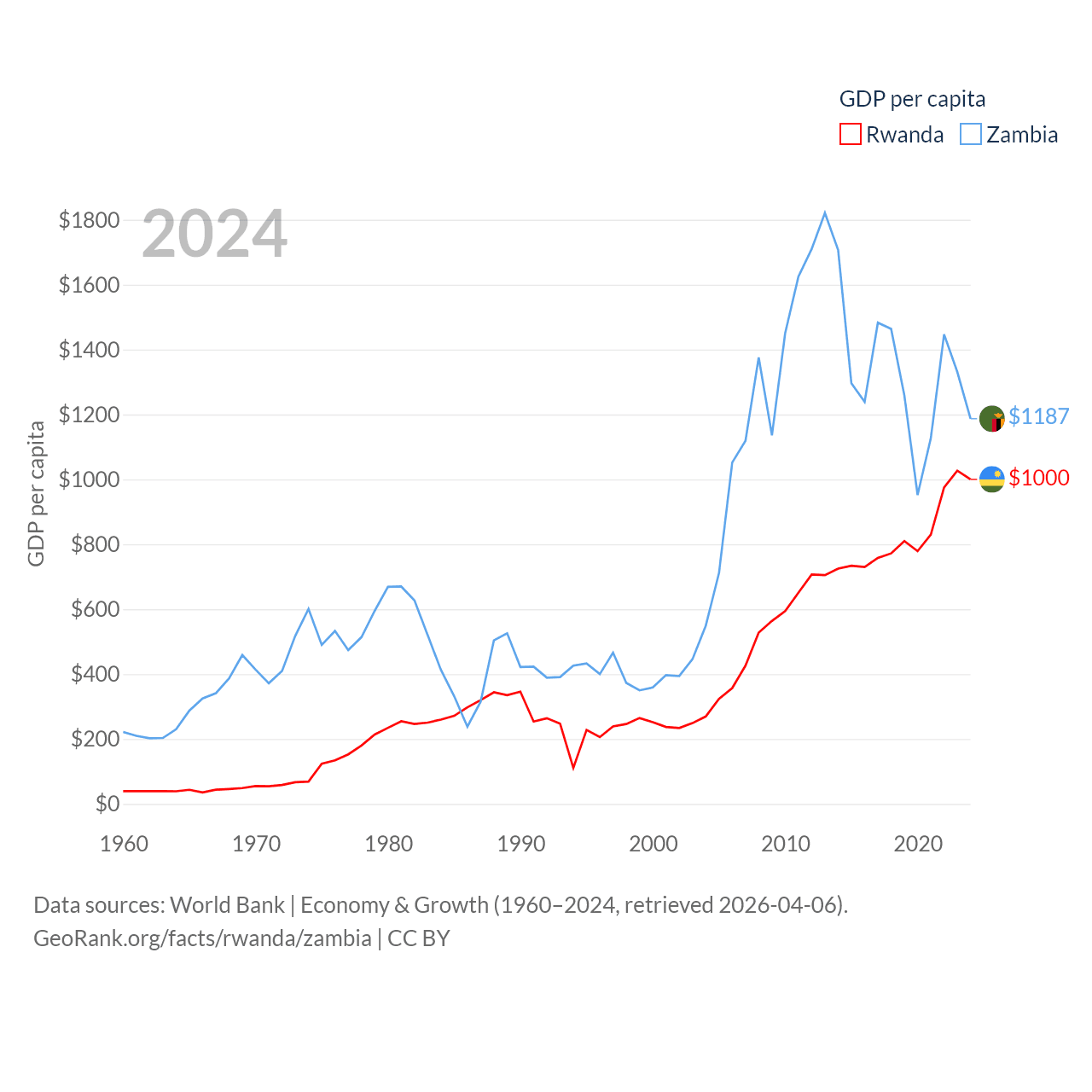 By GDP, Rwanda ranks 144/197 ($14.3B) and Zambia ranks 116/197 ($25.3B). By GDP per capita, Rwanda ranks 178/197 ($1,000), while Zambia ranks 169/197 ($1,187).