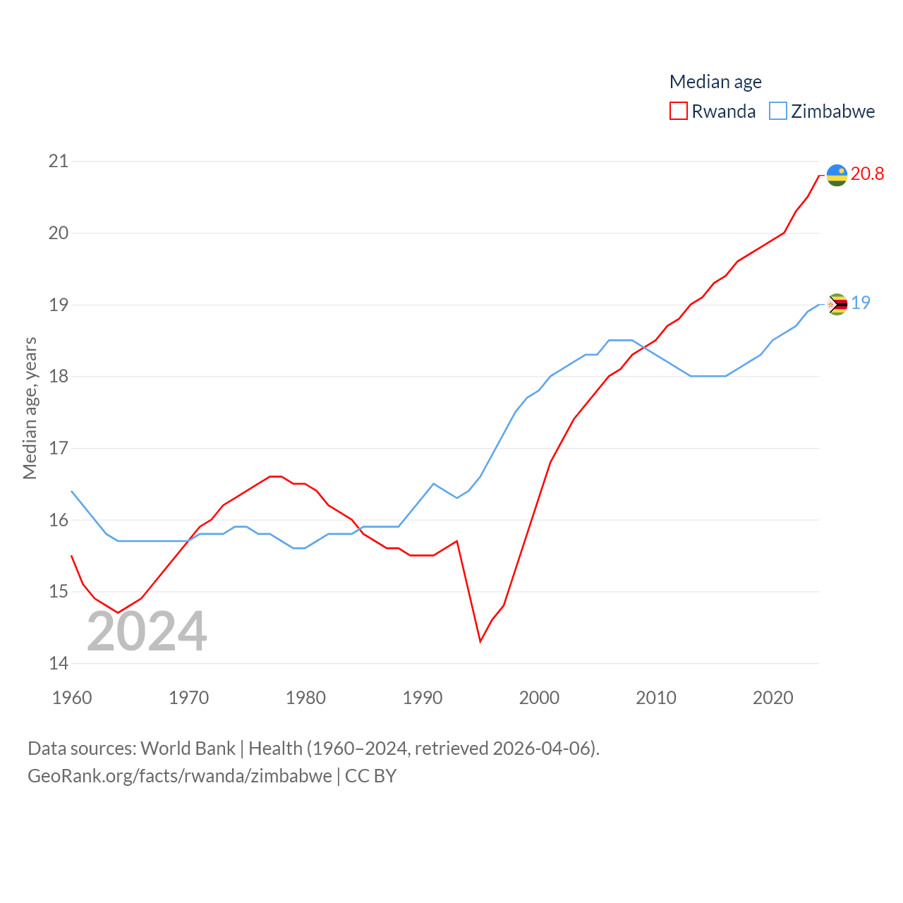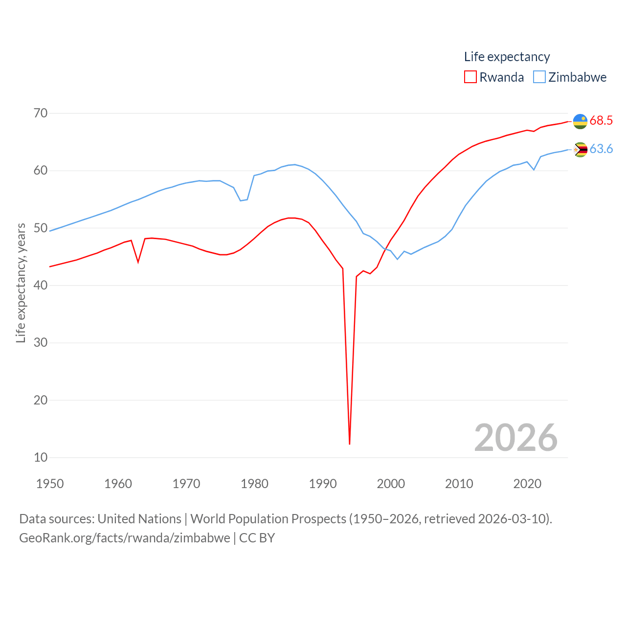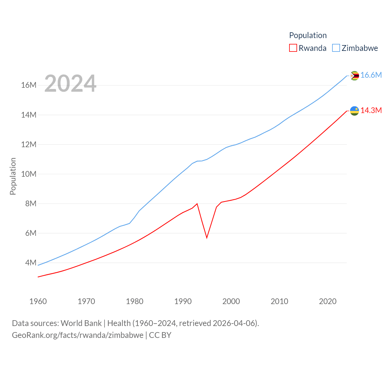 Rwanda has a population of 14.3M (ranked 77/197), compared with 16.6M in Zimbabwe (ranked 74/197). Rwanda's land area is 9,525 sq mi versus 149,364 sq mi for Zimbabwe (ranked 146th vs. 60th).