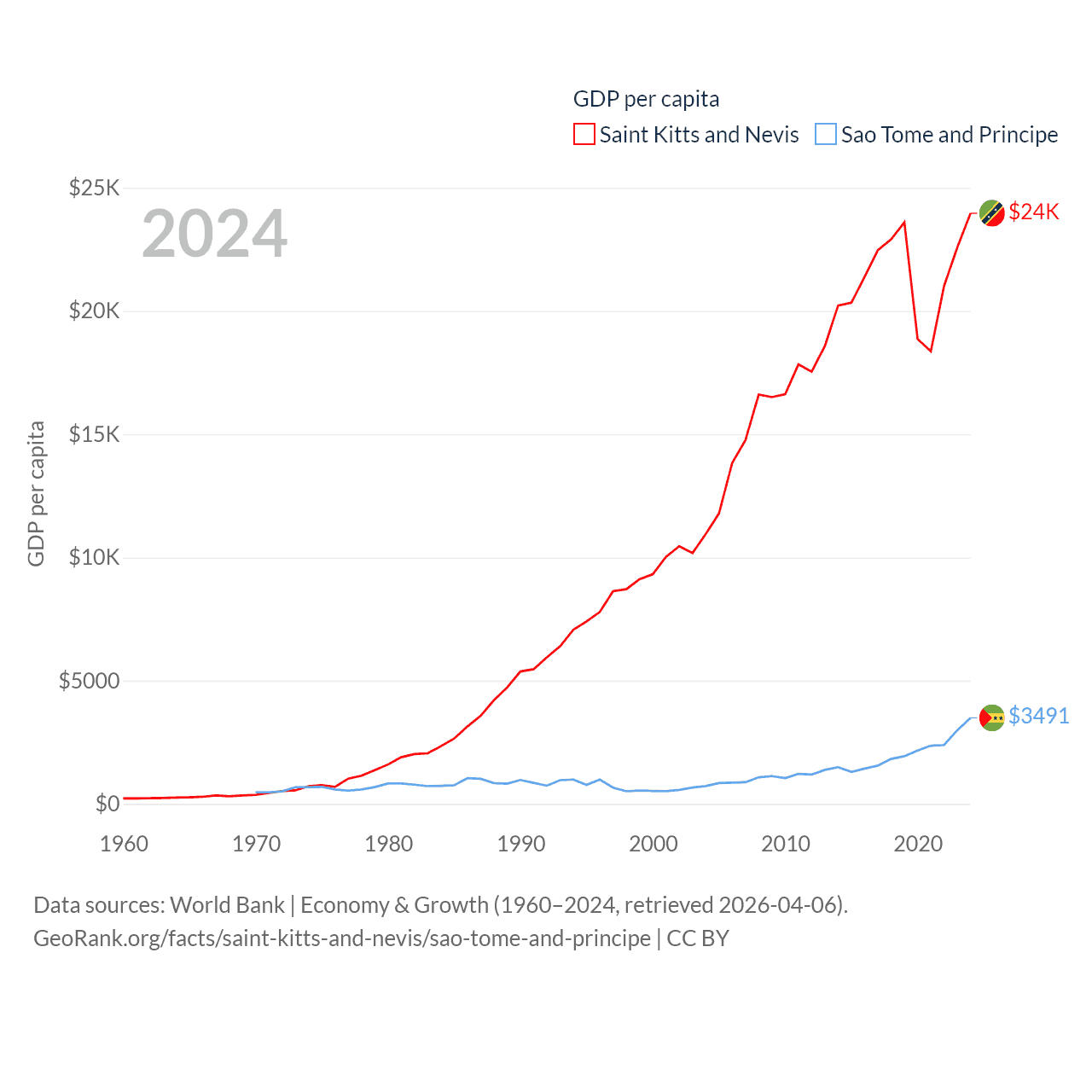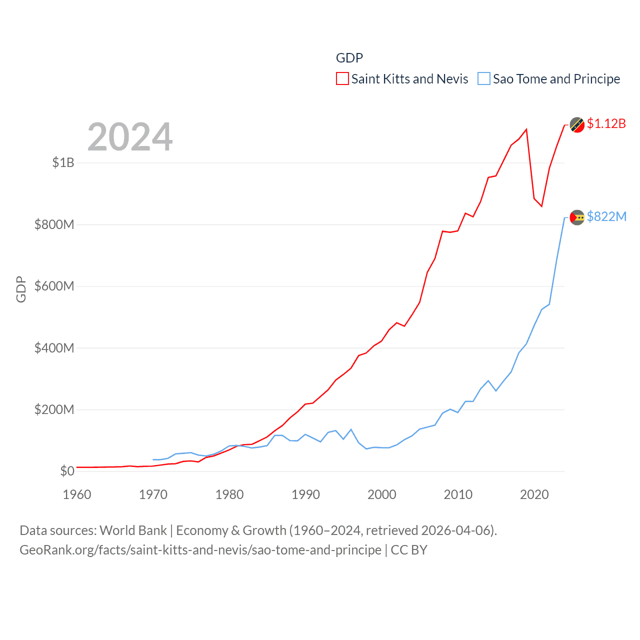 By GDP, Saint Kitts and Nevis ranks 187/197 ($1.12B) and Sao Tome and Principe ranks 189/197 ($822M). By GDP per capita, Saint Kitts and Nevis ranks 51/197 ($23,961), while Sao Tome and Principe ranks 134/197 ($3,491).