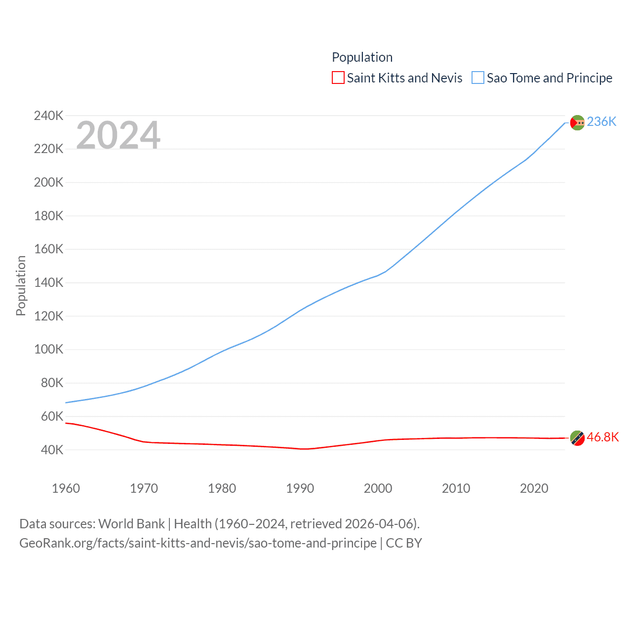 Saint Kitts and Nevis has a population of 46.8K (ranked 189/197), compared with 236K in Sao Tome and Principe (ranked 176/197). Saint Kitts and Nevis' land area is 100.4 sq mi versus 371 sq mi for Sao Tome and Principe (ranked 189th vs. 172nd).