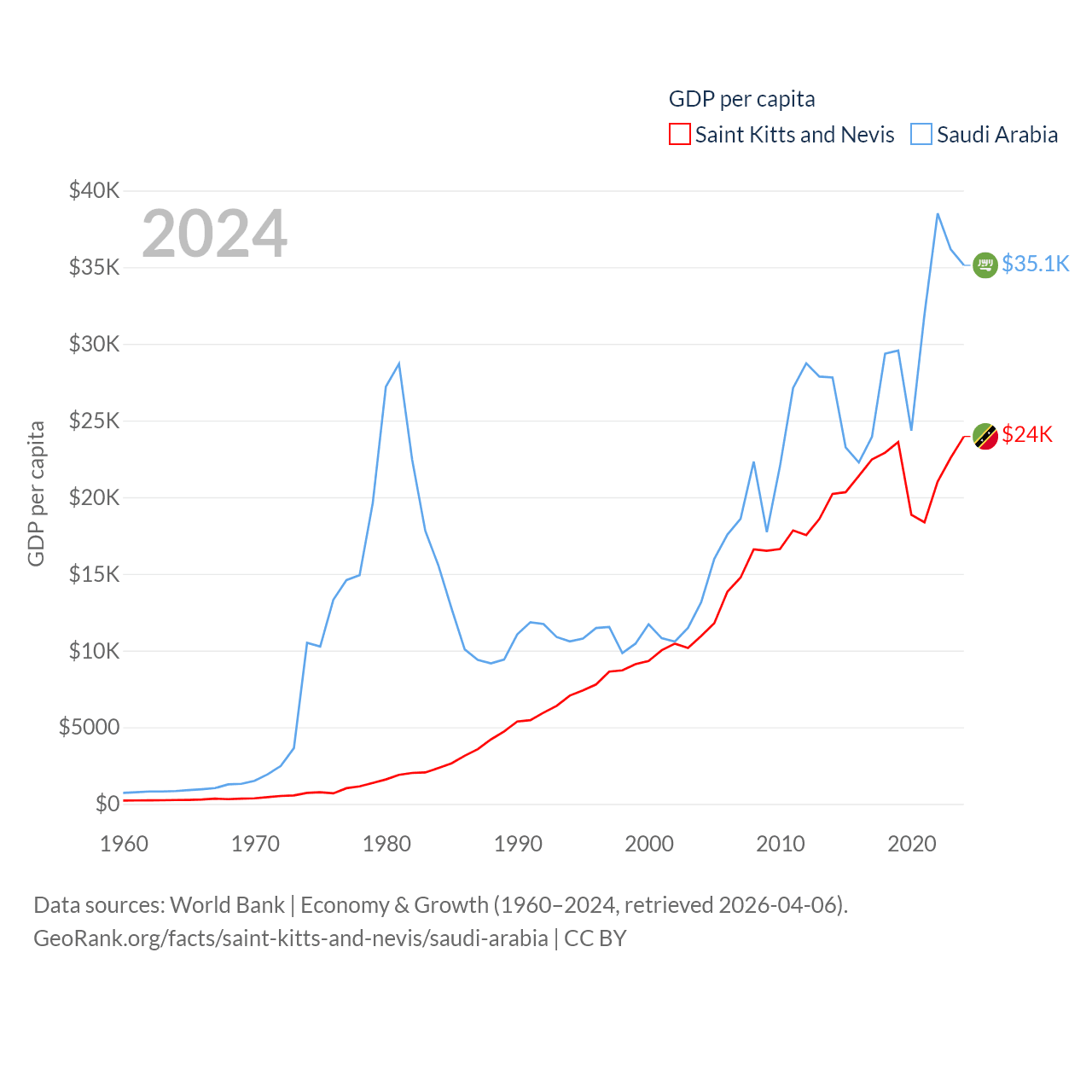 By GDP, Saint Kitts and Nevis ranks 187/197 ($1.12B) and Saudi Arabia ranks 18/197 ($1.24T). By GDP per capita, Saint Kitts and Nevis ranks 51/197 ($23,961), while Saudi Arabia ranks 33/197 ($35,122).