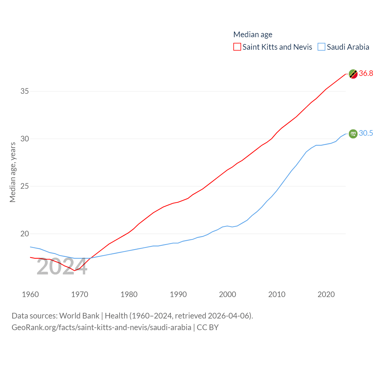 Saint Kitts and Nevis has a population of 46.8K (ranked 189/197), compared with 35.3M in Saudi Arabia (ranked 45/197). Saint Kitts and Nevis' land area is 100.4 sq mi versus 830,000 sq mi for Saudi Arabia (ranked 189th vs. 12th).
