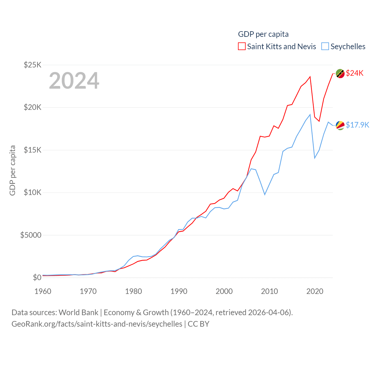 By GDP, Saint Kitts and Nevis ranks 187/197 ($1.12B) and The Seychelles ranks 178/197 ($2.17B). By GDP per capita, Saint Kitts and Nevis ranks 51/197 ($23,961), while The Seychelles ranks 63/197 ($17,859).