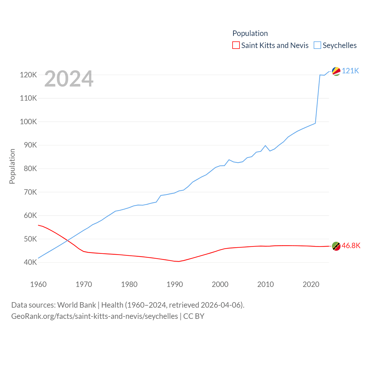 Saint Kitts and Nevis has a population of 46.8K (ranked 189/197), compared with 121K in The Seychelles (ranked 181/197). Saint Kitts and Nevis' land area is 100.4 sq mi versus 177.6 sq mi for The Seychelles (ranked 189th vs. 181st).