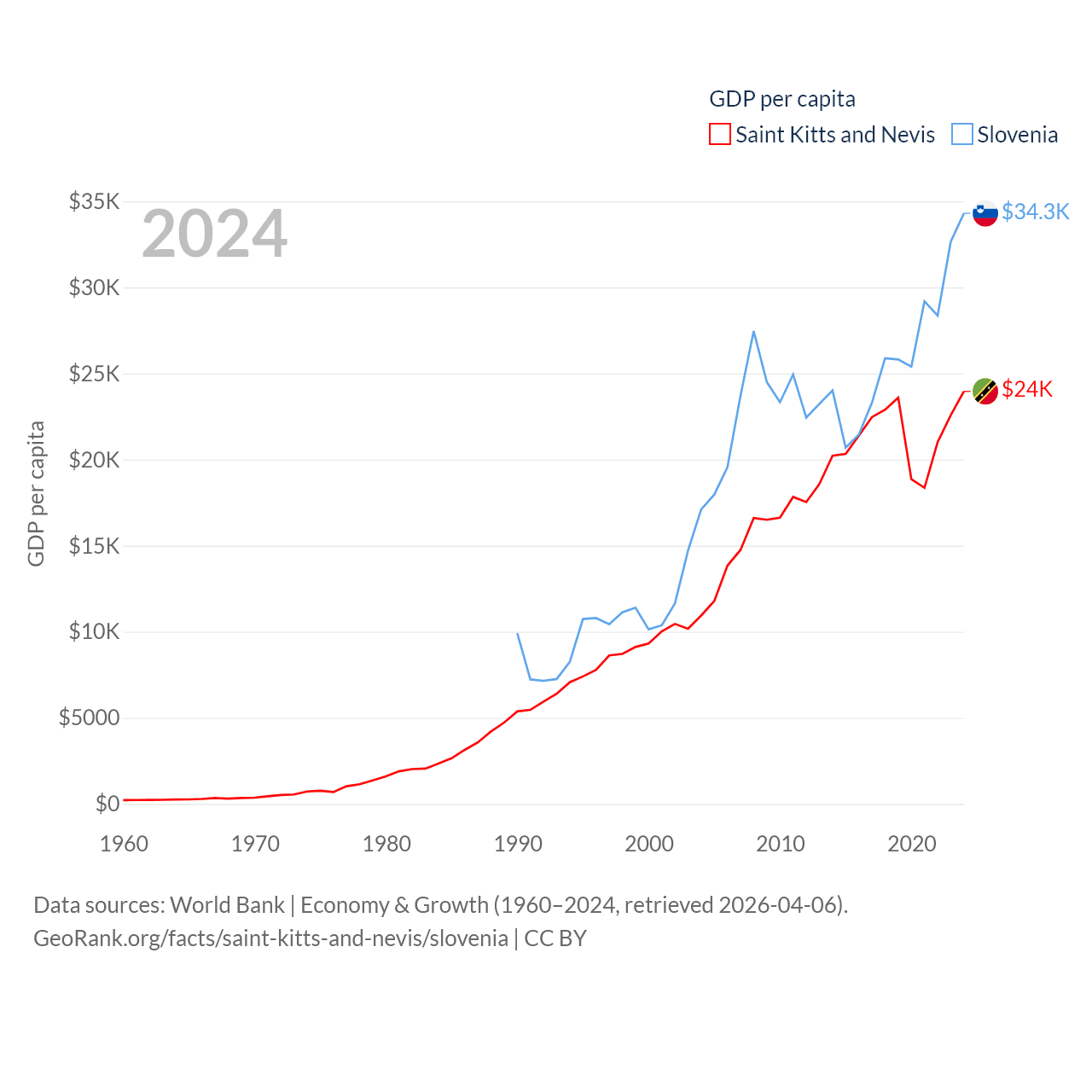 By GDP, Saint Kitts and Nevis ranks 187/197 ($1.12B) and Slovenia ranks 86/197 ($73B). By GDP per capita, Saint Kitts and Nevis ranks 51/197 ($23,961), while Slovenia ranks 34/197 ($34,301).