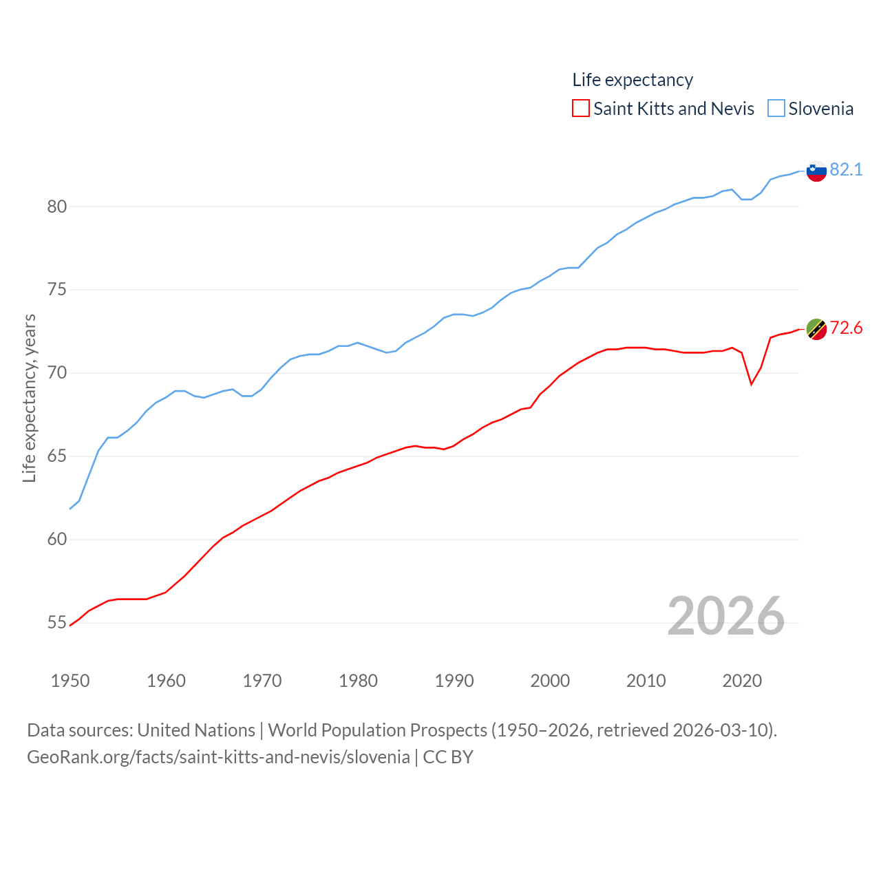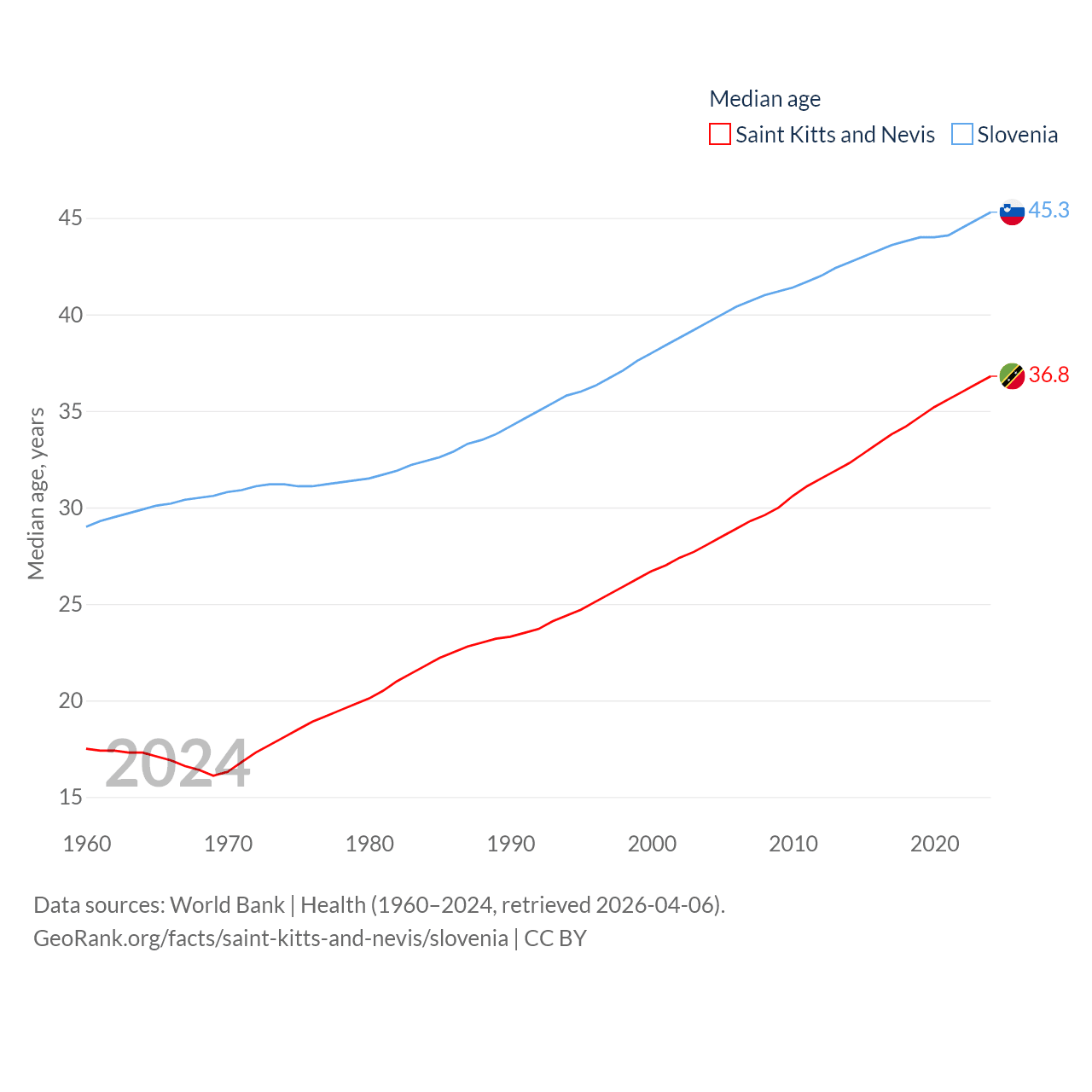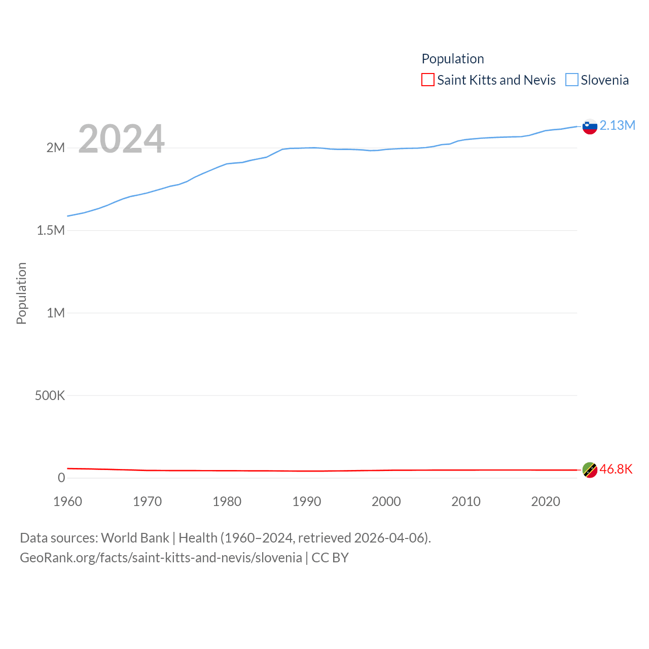 Saint Kitts and Nevis has a population of 46.8K (ranked 189/197), compared with 2.13M in Slovenia (ranked 147/197). Saint Kitts and Nevis' land area is 100.4 sq mi versus 7,774 sq mi for Slovenia (ranked 189th vs. 151st).