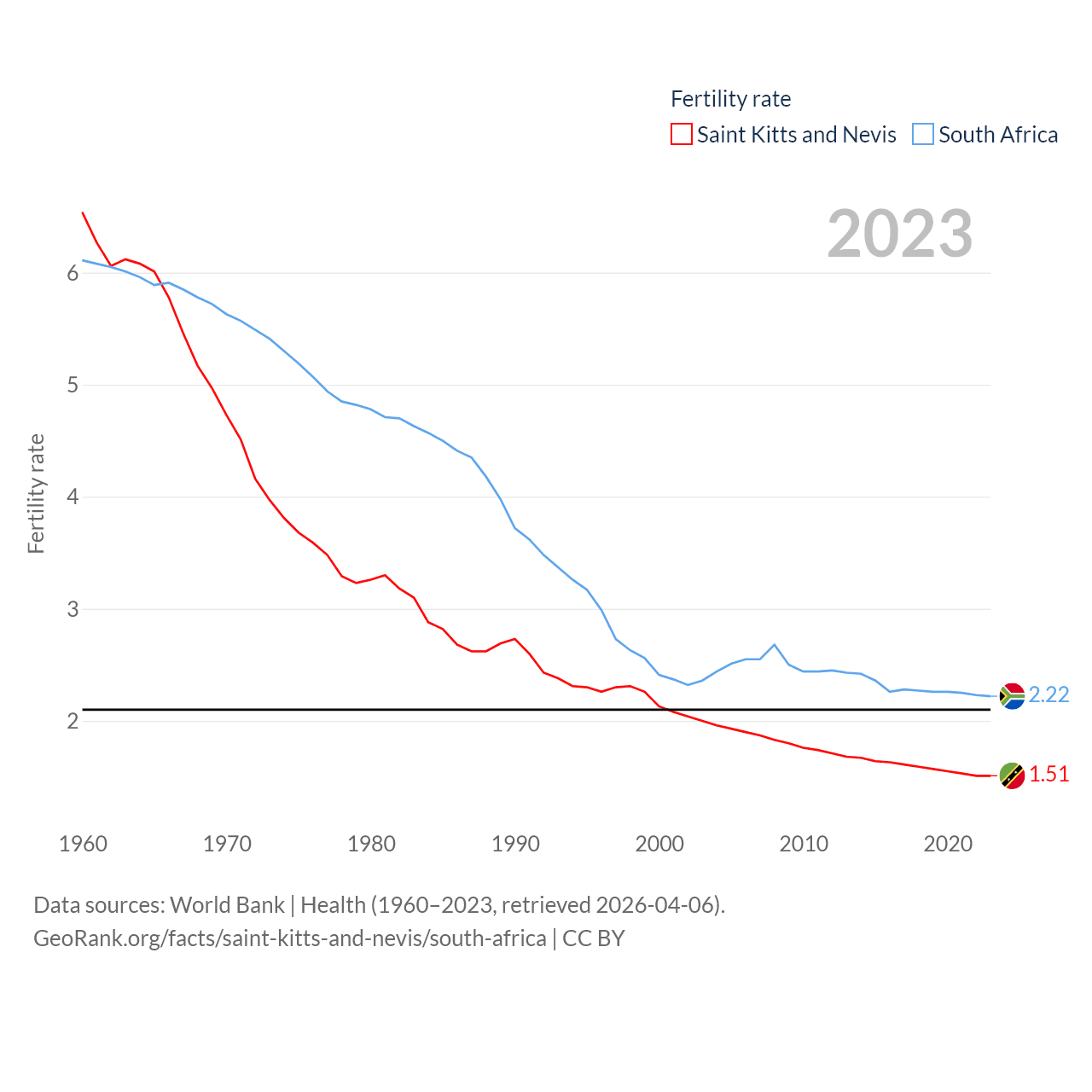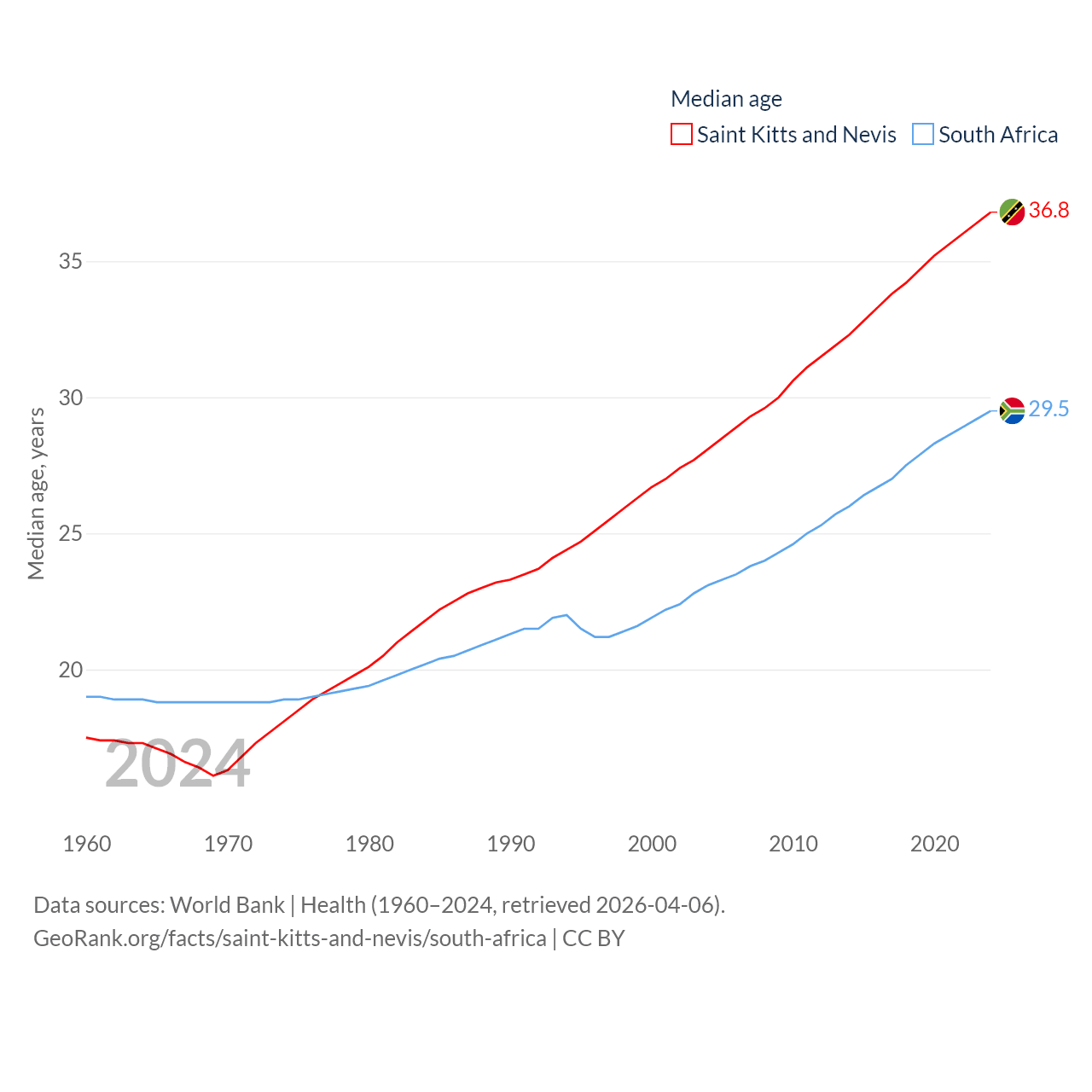 Saint Kitts and Nevis has a population of 46.8K (ranked 189/197), compared with 64M in South Africa (ranked 24/197). Saint Kitts and Nevis' land area is 100.4 sq mi versus 468,377 sq mi for South Africa (ranked 189th vs. 24th).