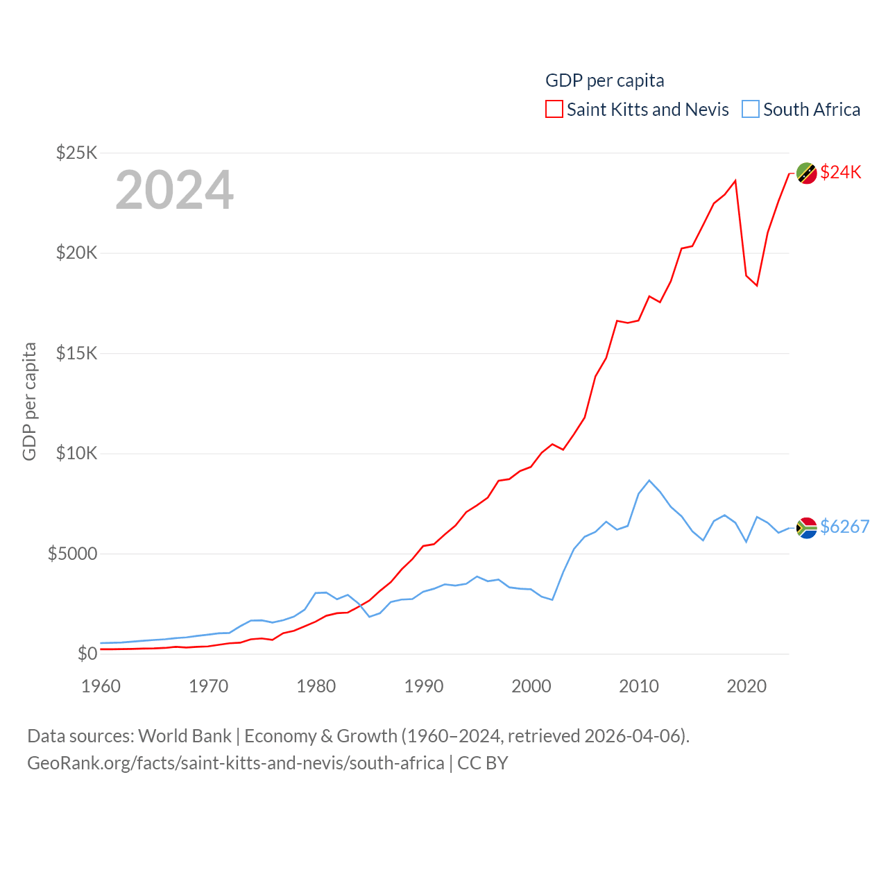 By GDP, Saint Kitts and Nevis ranks 187/197 ($1.12B) and South Africa ranks 40/197 ($401B). By GDP per capita, Saint Kitts and Nevis ranks 51/197 ($23,961), while South Africa ranks 111/197 ($6,267).