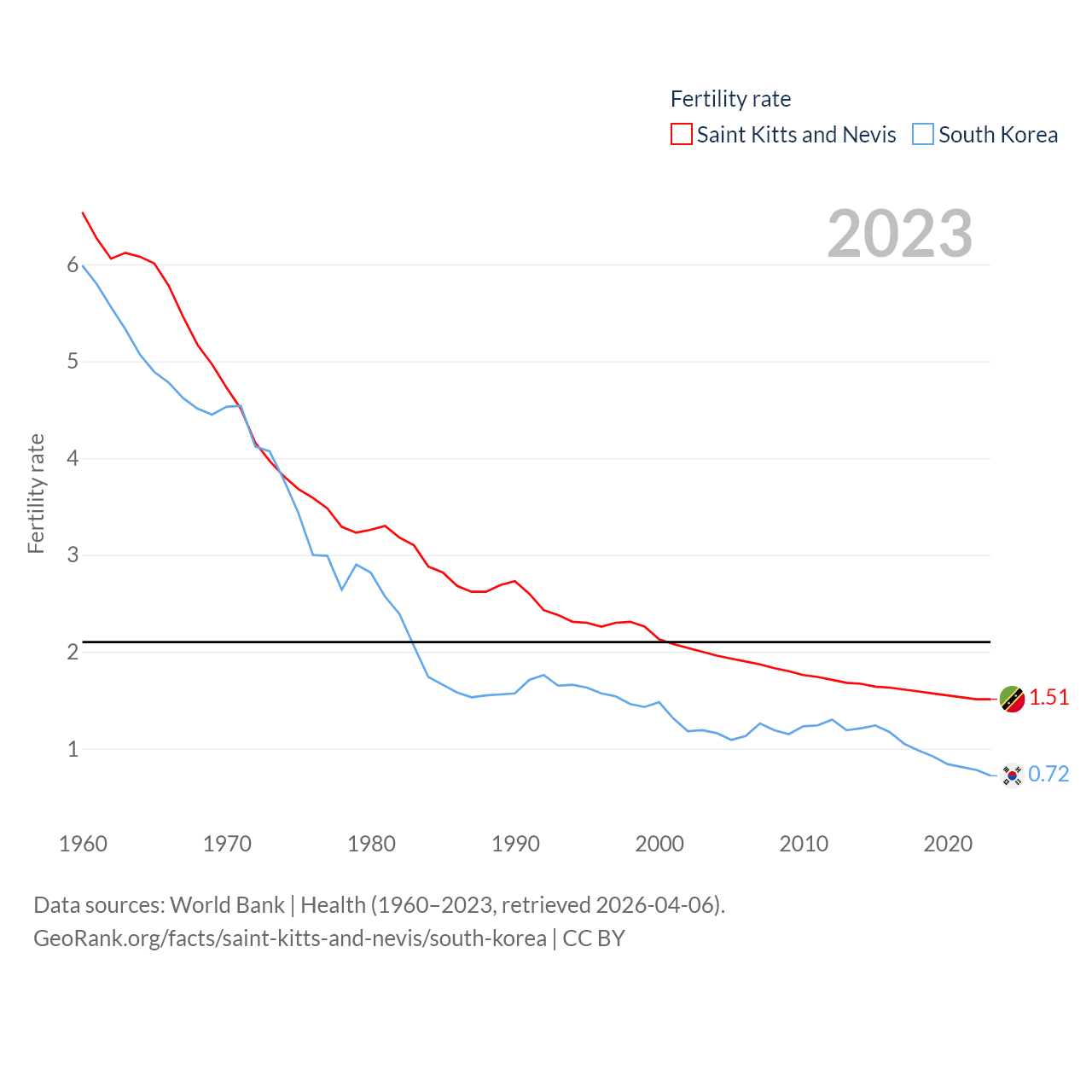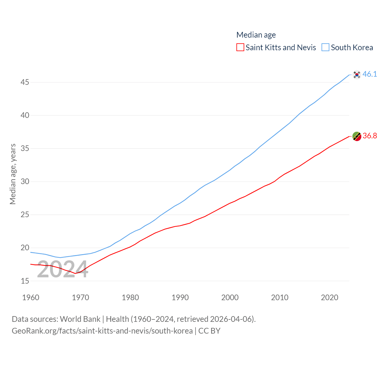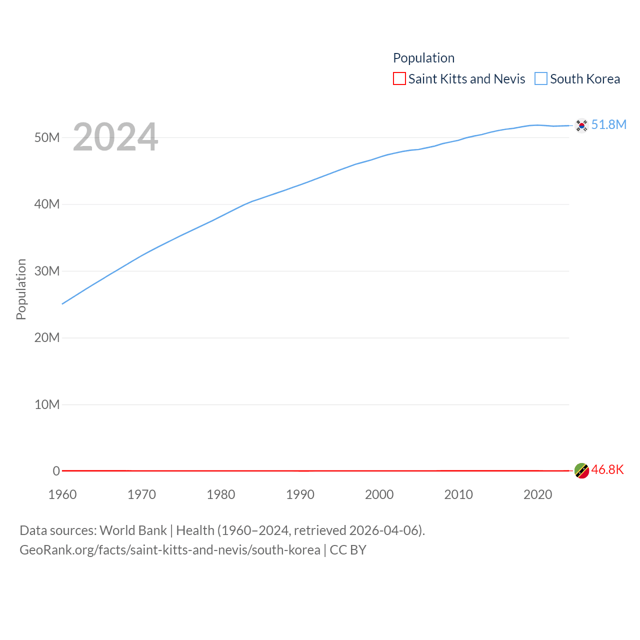 Saint Kitts and Nevis has a population of 46.8K (ranked 189/197), compared with 51.8M in South Korea (ranked 29/197). Saint Kitts and Nevis' land area is 100.4 sq mi versus 37,684 sq mi for South Korea (ranked 189th vs. 105th).