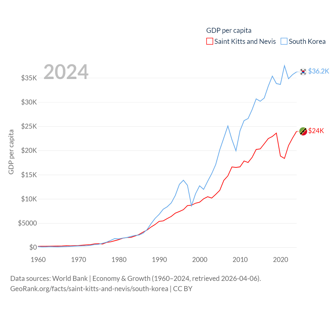 By GDP, Saint Kitts and Nevis ranks 187/197 ($1.12B) and South Korea ranks 12/197 ($1.88T). By GDP per capita, Saint Kitts and Nevis ranks 51/197 ($23,961), while South Korea ranks 31/197 ($36,239).