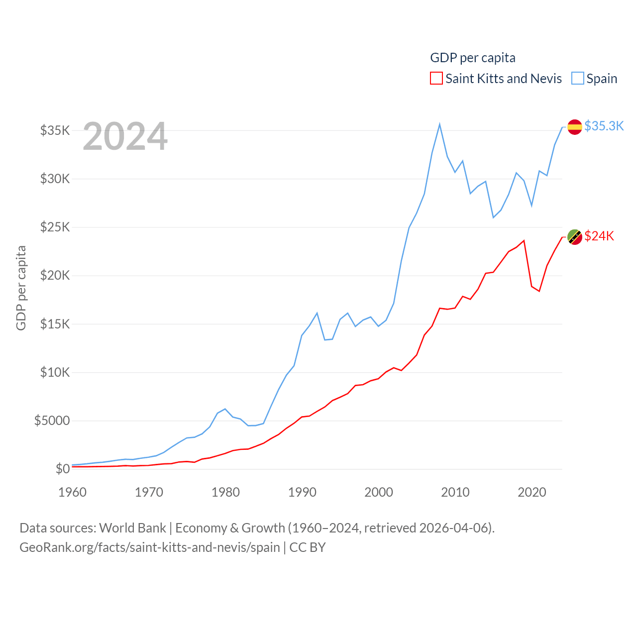 By GDP, Saint Kitts and Nevis ranks 187/197 ($1.12B) and Spain ranks 15/197 ($1.73T). By GDP per capita, Saint Kitts and Nevis ranks 51/197 ($23,961), while Spain ranks 32/197 ($35,327).