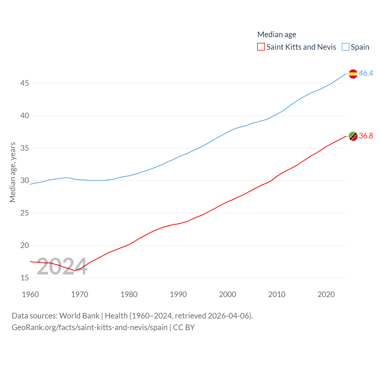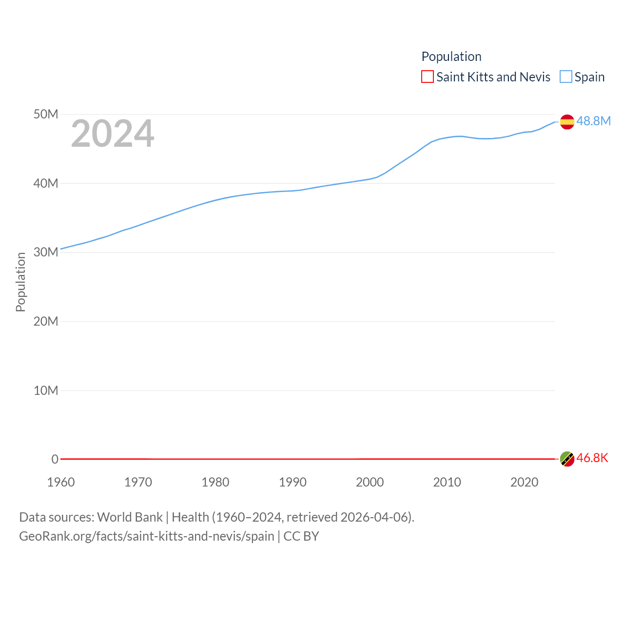 Saint Kitts and Nevis has a population of 46.8K (ranked 189/197), compared with 48.8M in Spain (ranked 32/197). Saint Kitts and Nevis' land area is 100.4 sq mi versus 192,934 sq mi for Spain (ranked 189th vs. 51st).
