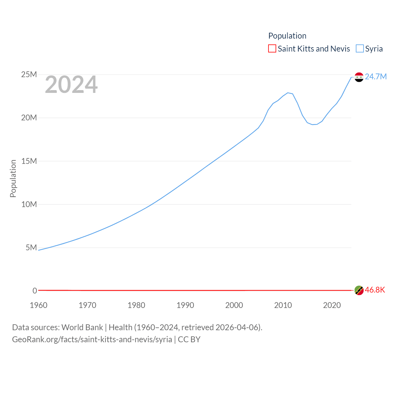 Saint Kitts and Nevis has a population of 46.8K (ranked 189/197), compared with 24.7M in Syria (ranked 57/197). Saint Kitts and Nevis' land area is 100.4 sq mi versus 70,900 sq mi for Syria (ranked 189th vs. 87th).