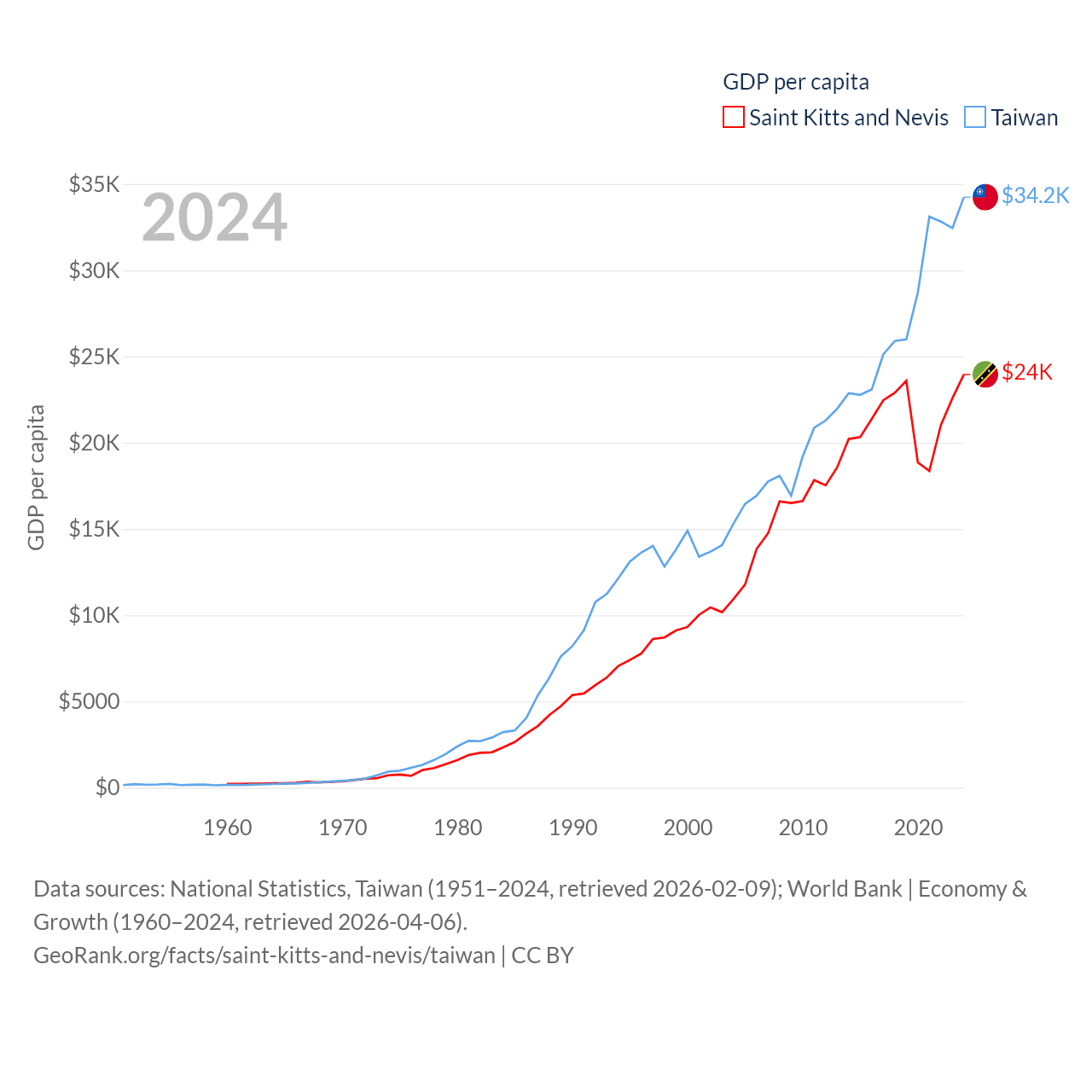 By GDP, Saint Kitts and Nevis ranks 187/197 ($1.12B) and Taiwan ranks 22/197 ($802B). By GDP per capita, Saint Kitts and Nevis ranks 51/197 ($23,961), while Taiwan ranks 35/197 ($34,238).