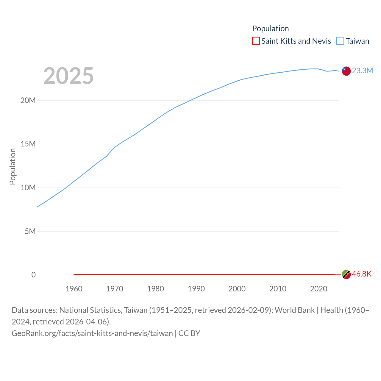 Saint Kitts and Nevis has a population of 46.8K (ranked 189/197), compared with 23.3M in Taiwan (ranked 60/197). Saint Kitts and Nevis' land area is 100.4 sq mi versus 13,976 sq mi for Taiwan (ranked 189th vs. 133rd).