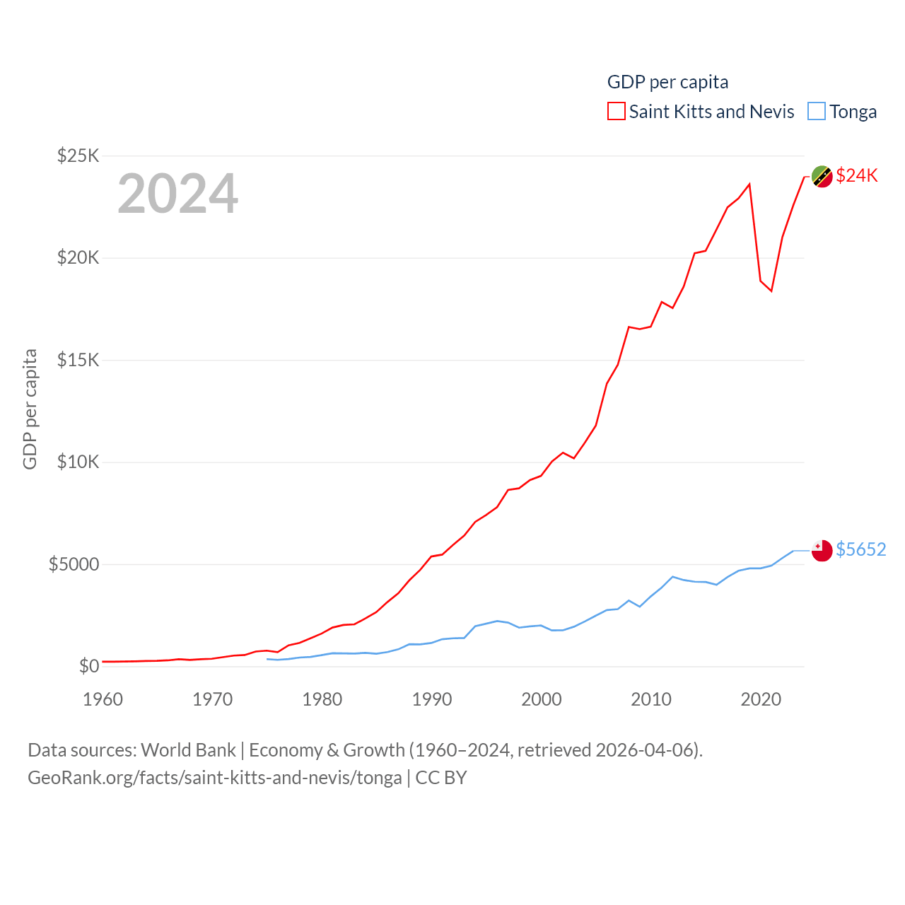 By GDP, Saint Kitts and Nevis ranks 187/197 ($1.12B) and Tonga ranks 191/197 ($591M). By GDP per capita, Saint Kitts and Nevis ranks 51/197 ($23,961), while Tonga ranks 115/197 ($5,652).
