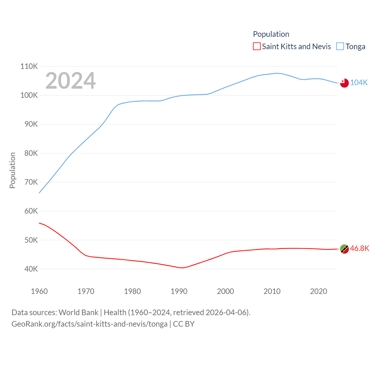 Saint Kitts and Nevis has a population of 46.8K (ranked 189/197), compared with 104K in Tonga (ranked 183/197). Saint Kitts and Nevis' land area is 100.4 sq mi versus 278 sq mi for Tonga (ranked 189th vs. 176th).
