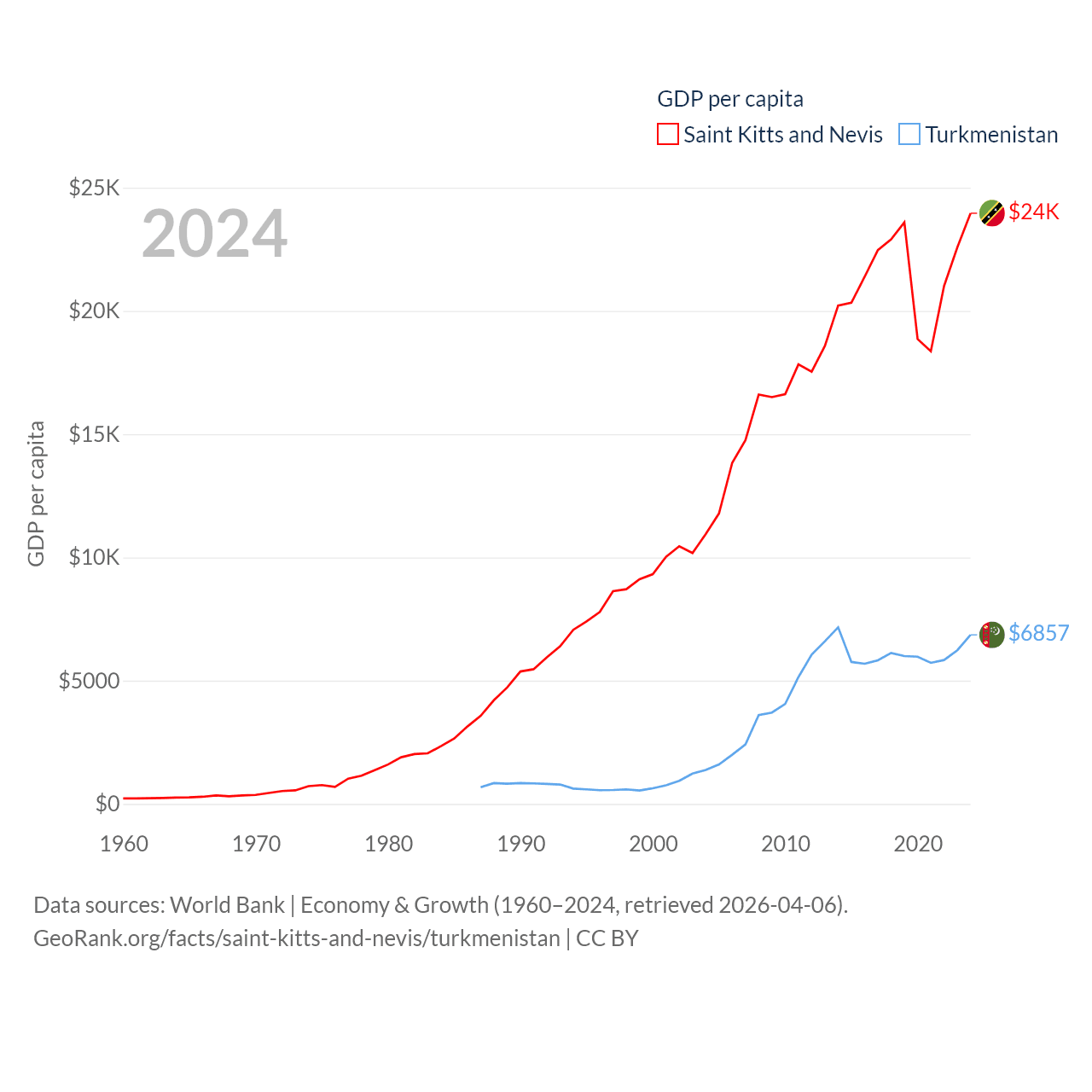 By GDP, Saint Kitts and Nevis ranks 187/197 ($1.12B) and Turkmenistan ranks 92/197 ($51.4B). By GDP per capita, Saint Kitts and Nevis ranks 51/197 ($23,961), while Turkmenistan ranks 104/197 ($6,857).