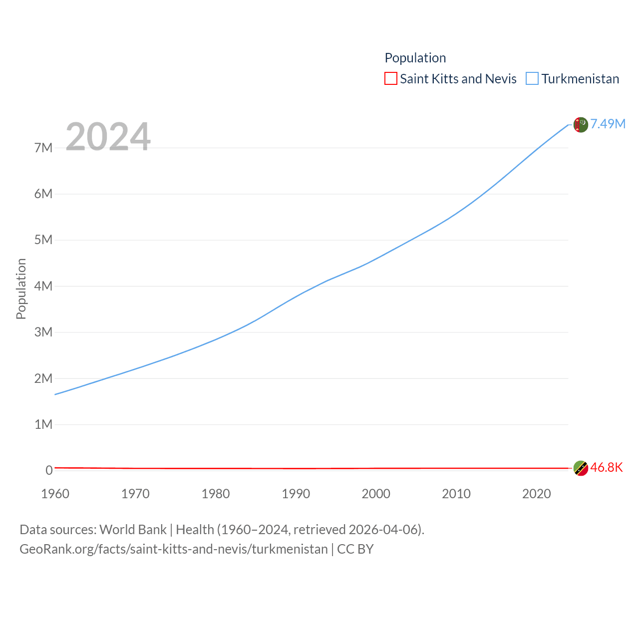 Saint Kitts and Nevis has a population of 46.8K (ranked 189/197), compared with 7.49M in Turkmenistan (ranked 104/197). Saint Kitts and Nevis' land area is 100.4 sq mi versus 181,441 sq mi for Turkmenistan (ranked 189th vs. 53rd).