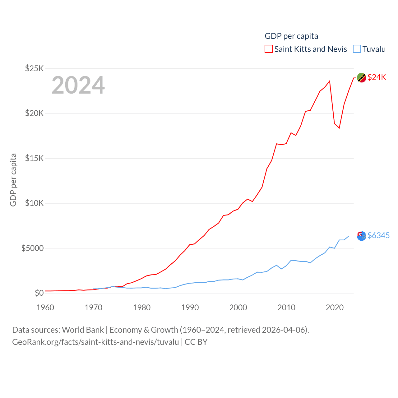 By GDP, Saint Kitts and Nevis ranks 187/197 ($1.12B) and Tuvalu ranks 196/197 ($62.3M). By GDP per capita, Saint Kitts and Nevis ranks 51/197 ($23,961), while Tuvalu ranks 110/197 ($6,345).